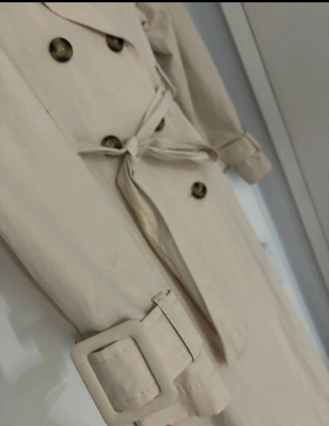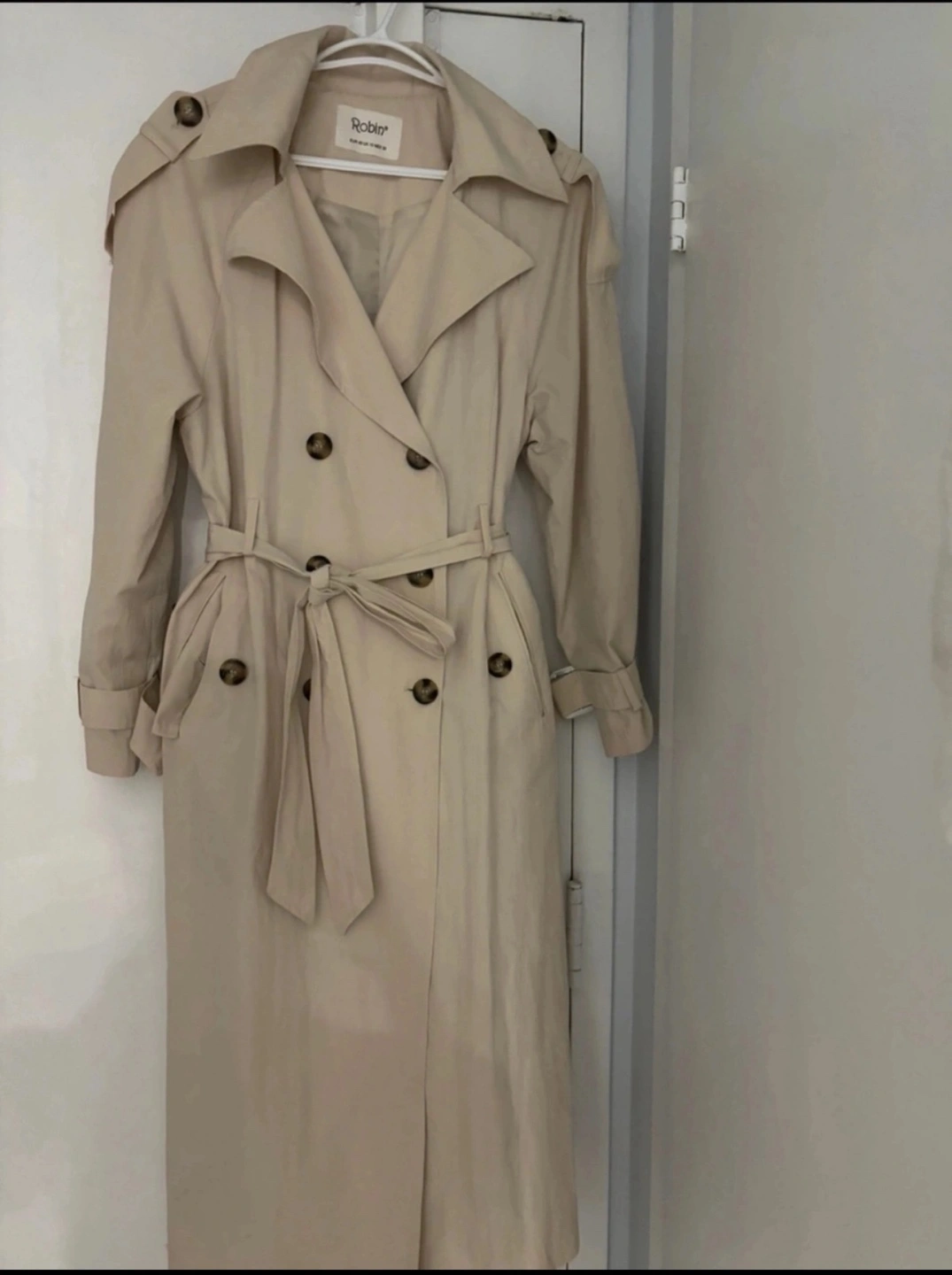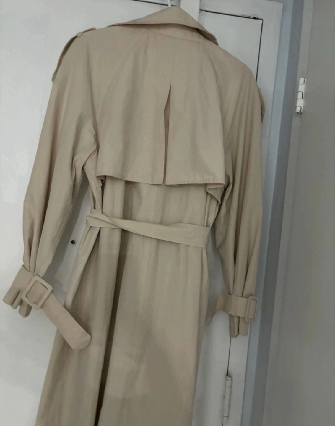 70Long beige trench coat. Double-breasted, belted. Features a classic collar and long sleeves with buttoned cuffs. Good for Spring or Autumn.