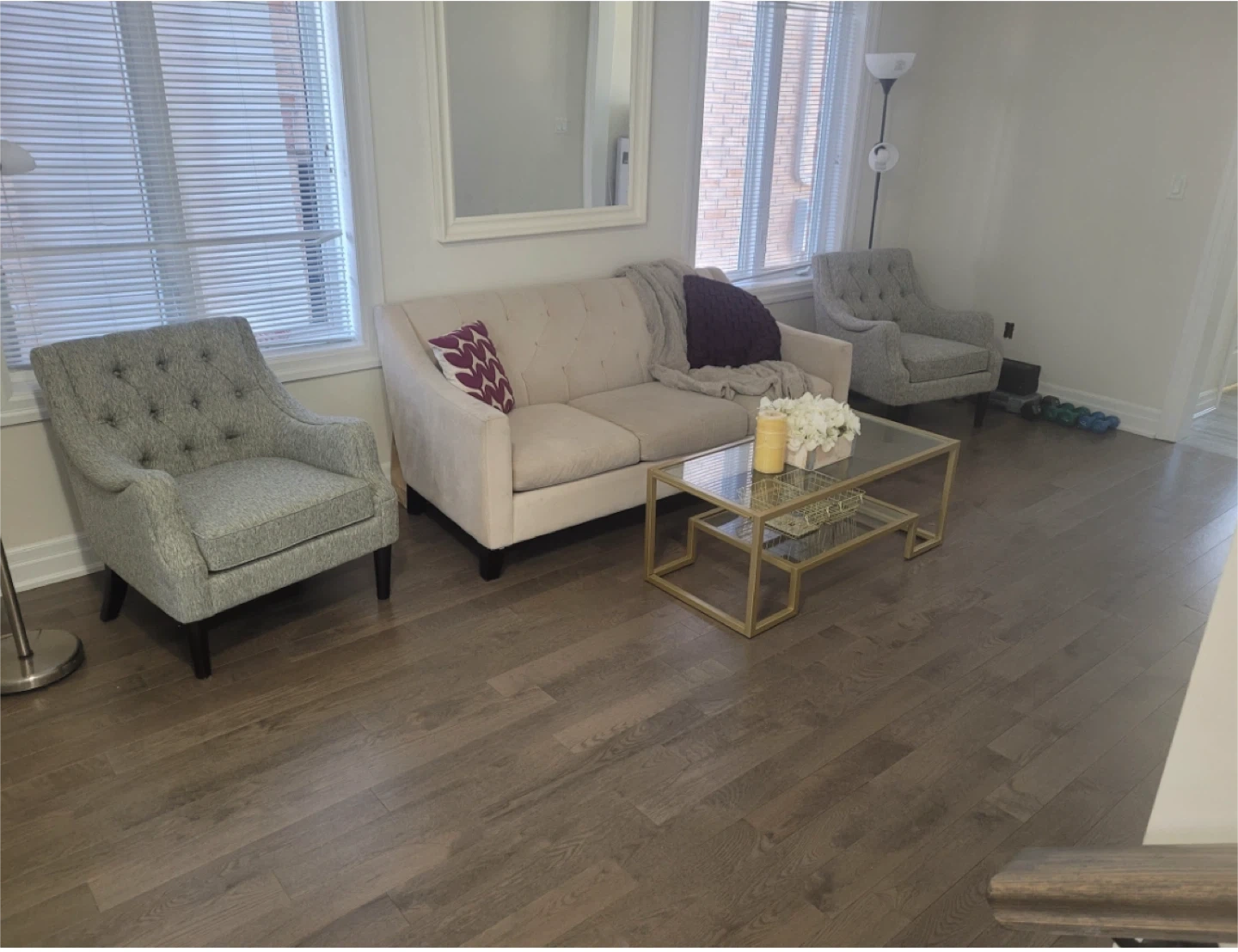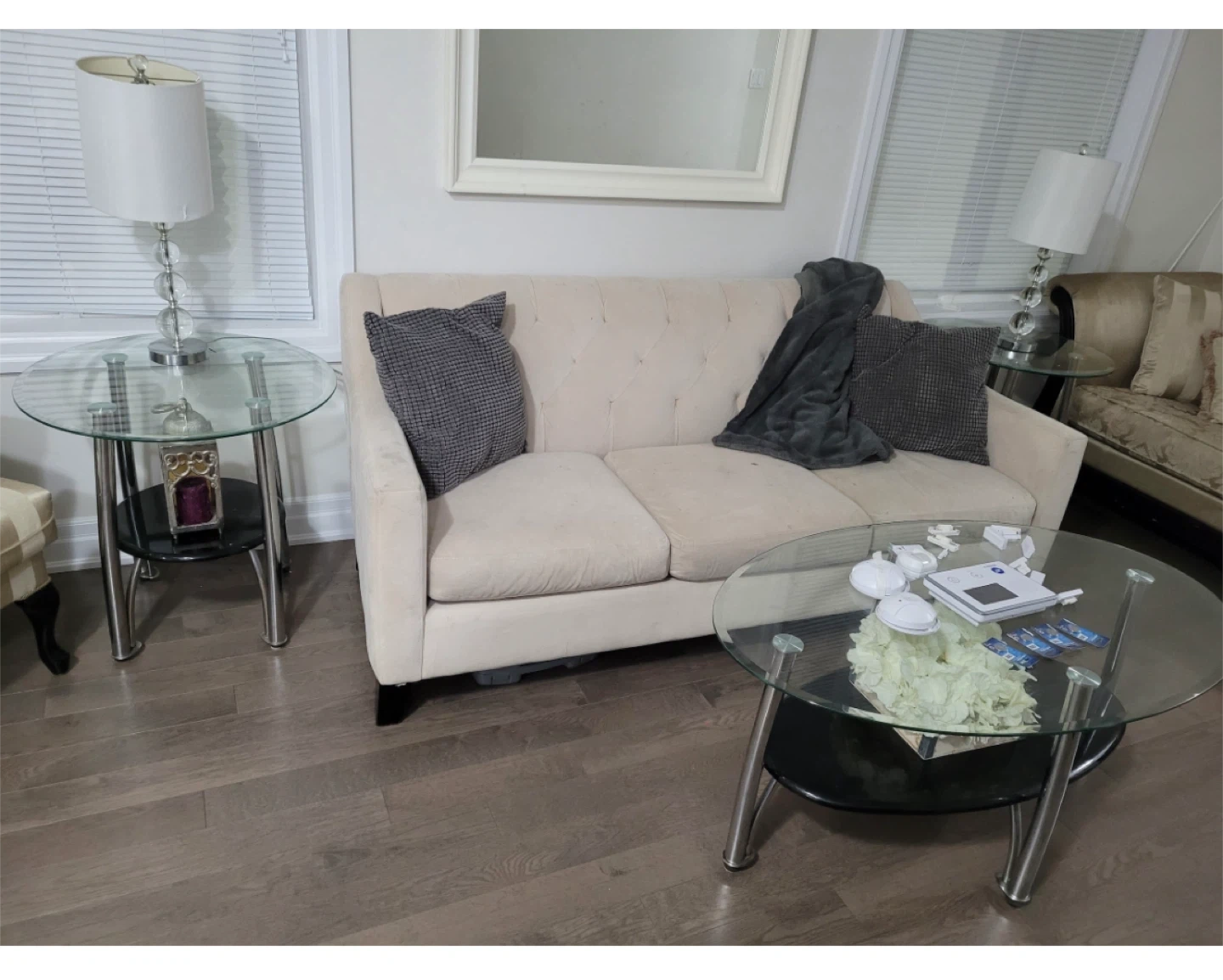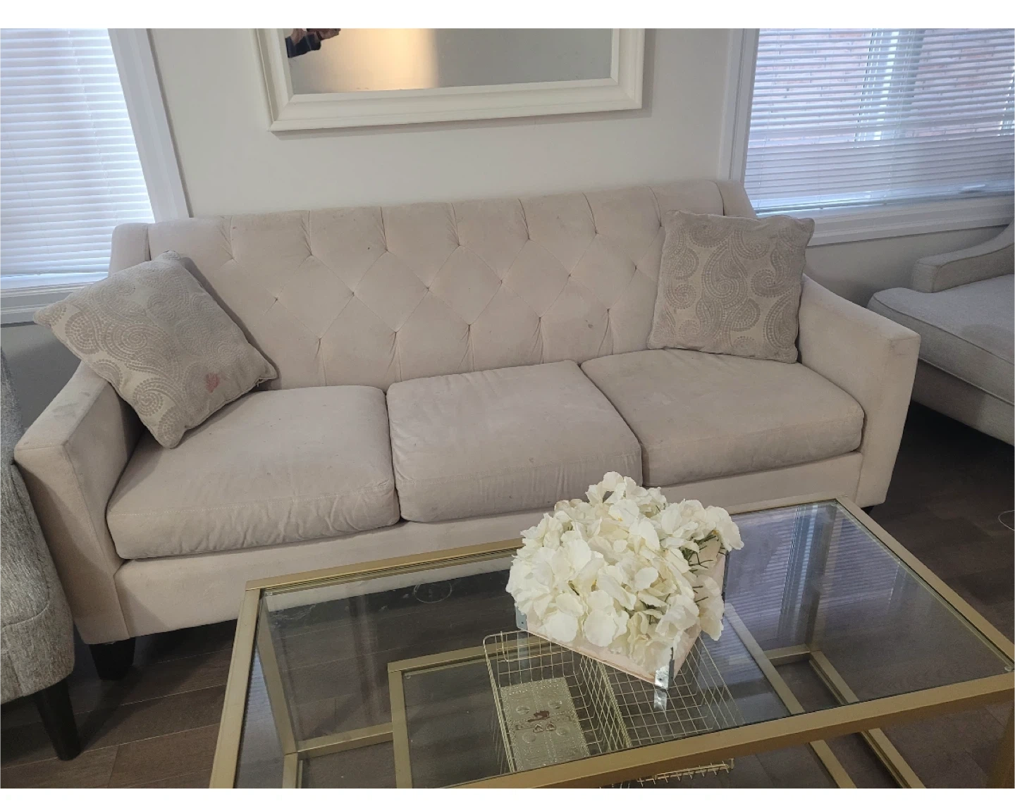 Selling a beige tufted sofa. It's in good condition and would be a great addition to any living room or den. The sofa has a classic design and neutral colour, making it easy to match with your existing decor. It has a comfortable design, perfect for relaxing! It needs a shampoo wash a bit