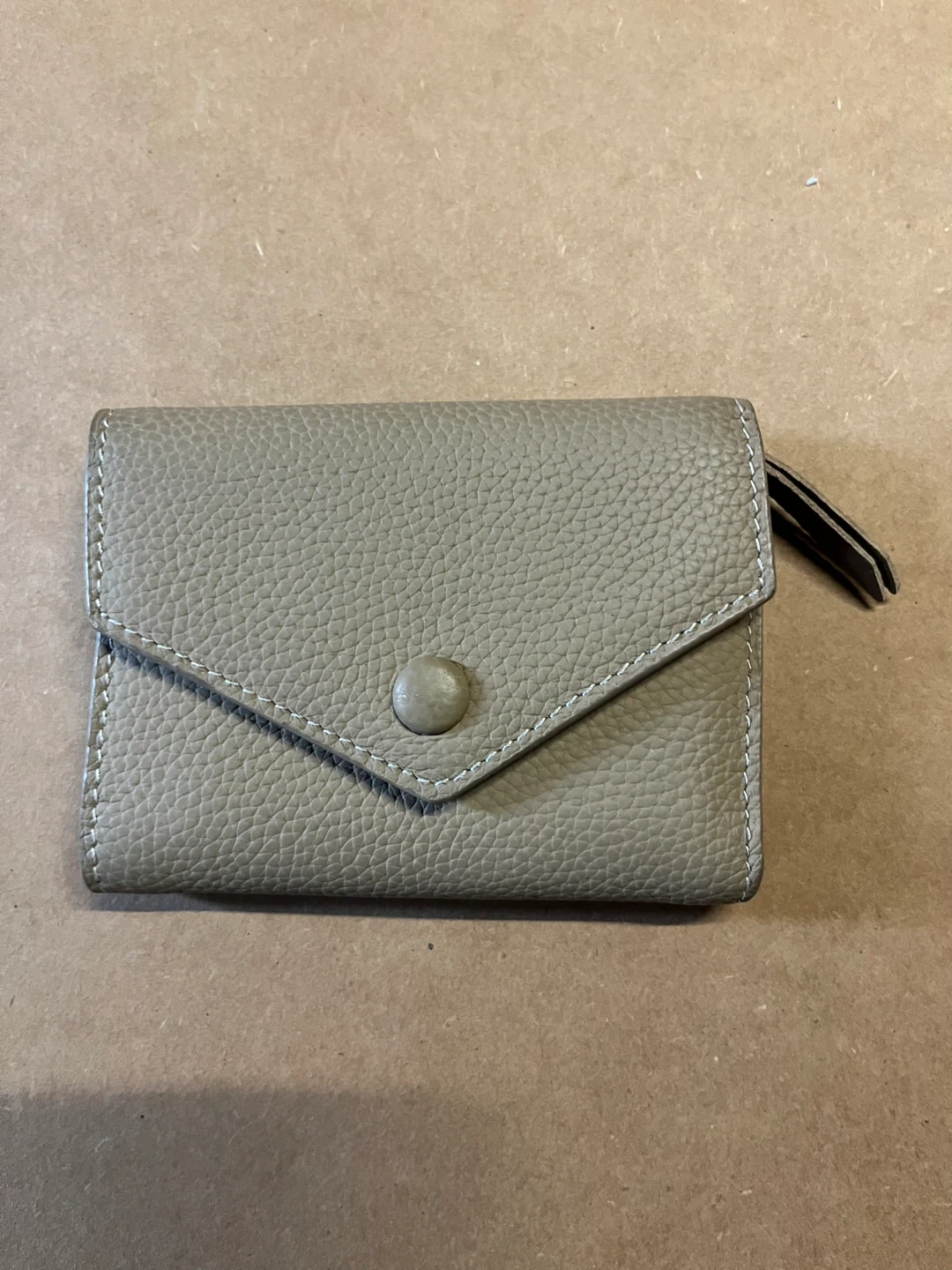 12Selling a beige wallet. It's in great condition and has a unique design with a button closure and a zipper compartment