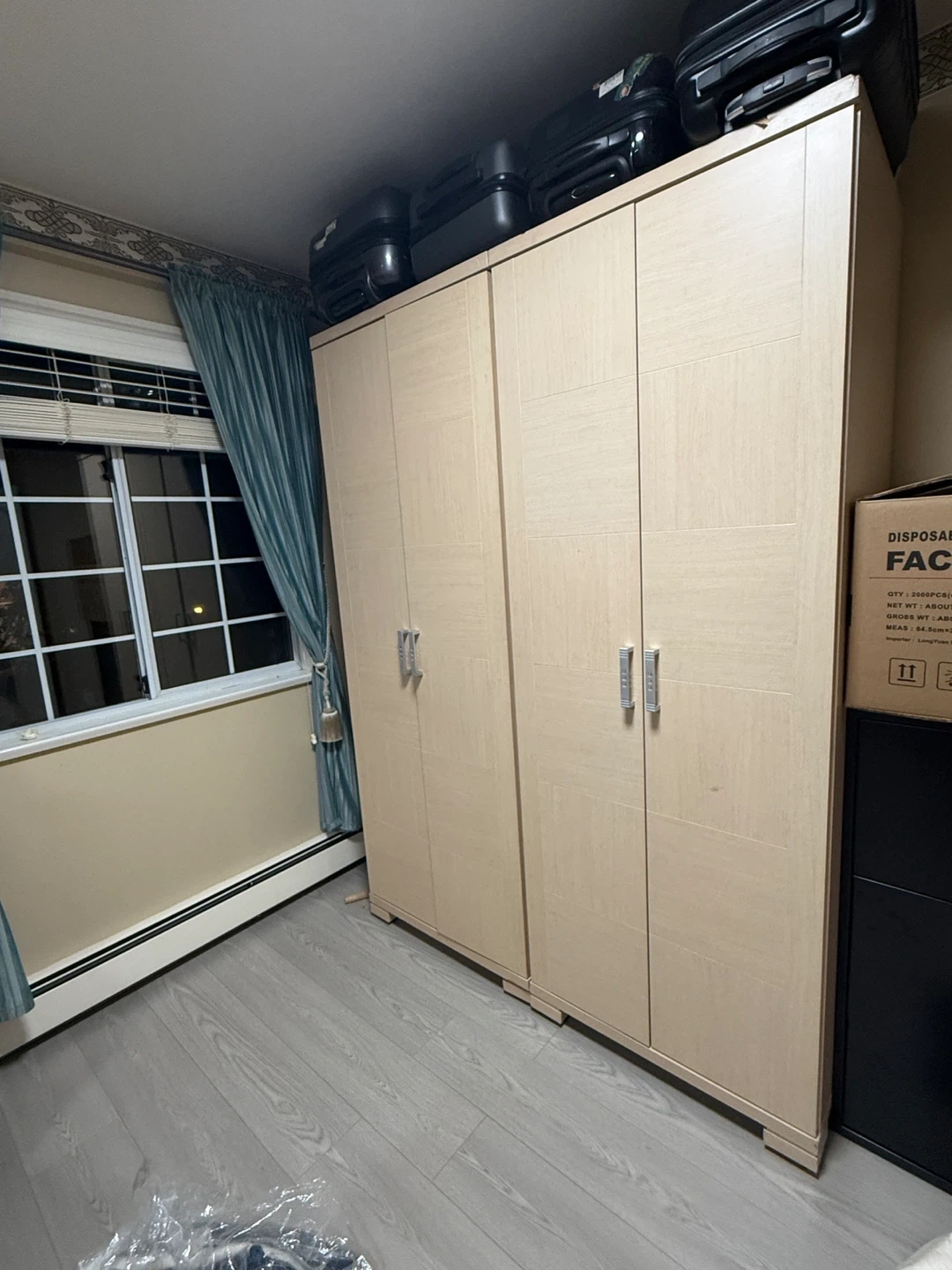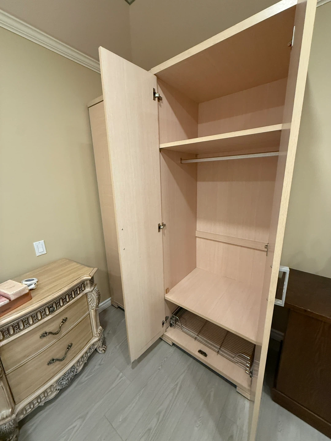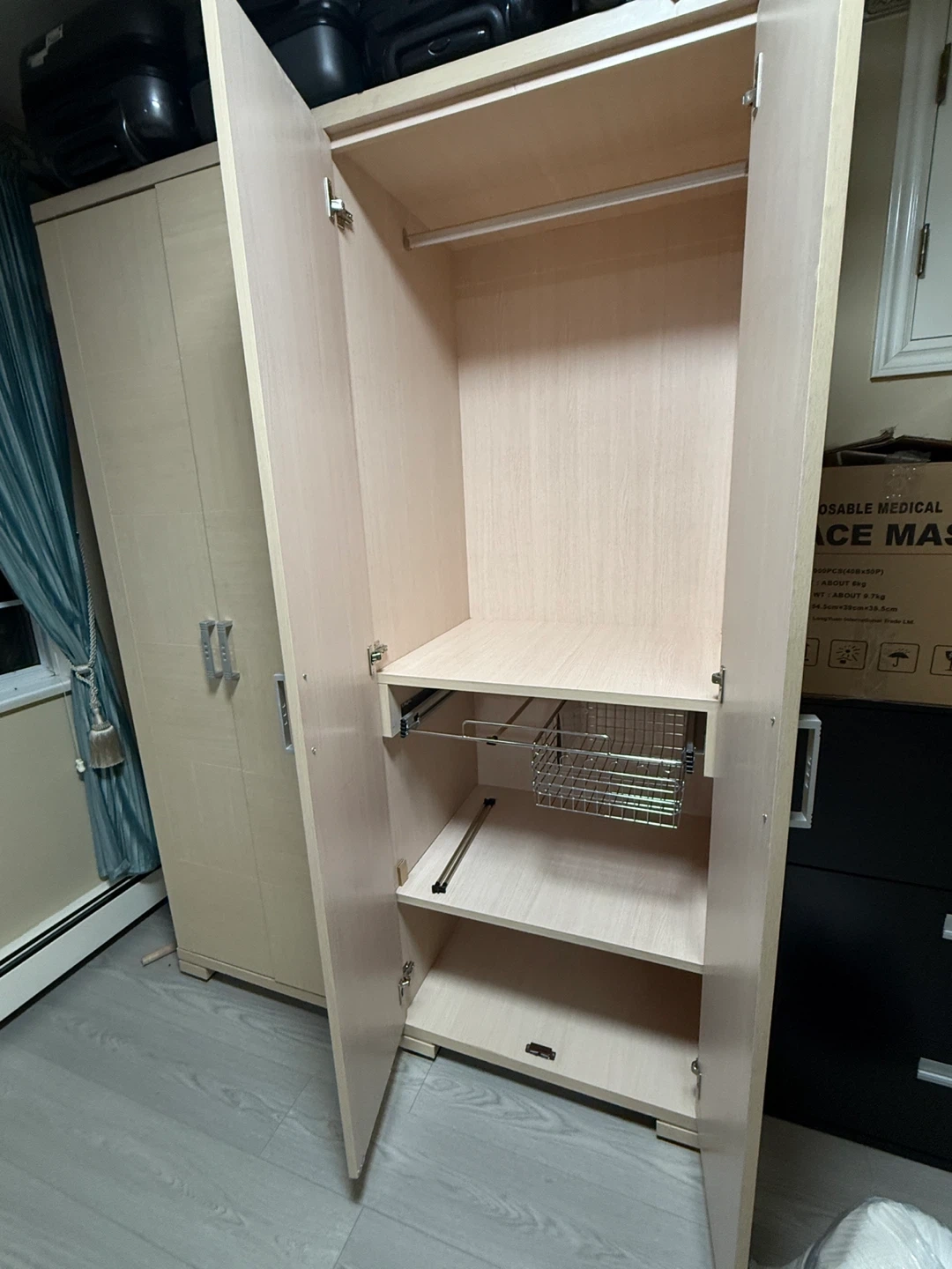 Selling a set of 4 closets / wardrobe in good condition! It features adjustable shelves, a clothes rail, and a pull-out drawer. It's perfect for organizing your clothes and accessories. Great for adding storage to any room One for $120 and all four for $400. Height is 81 inch Weight is 30 inch