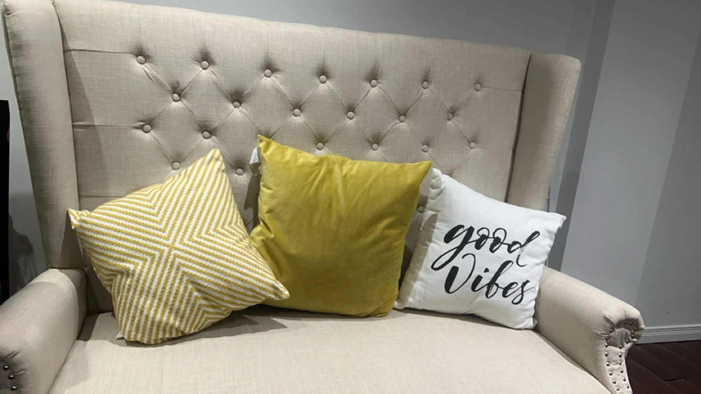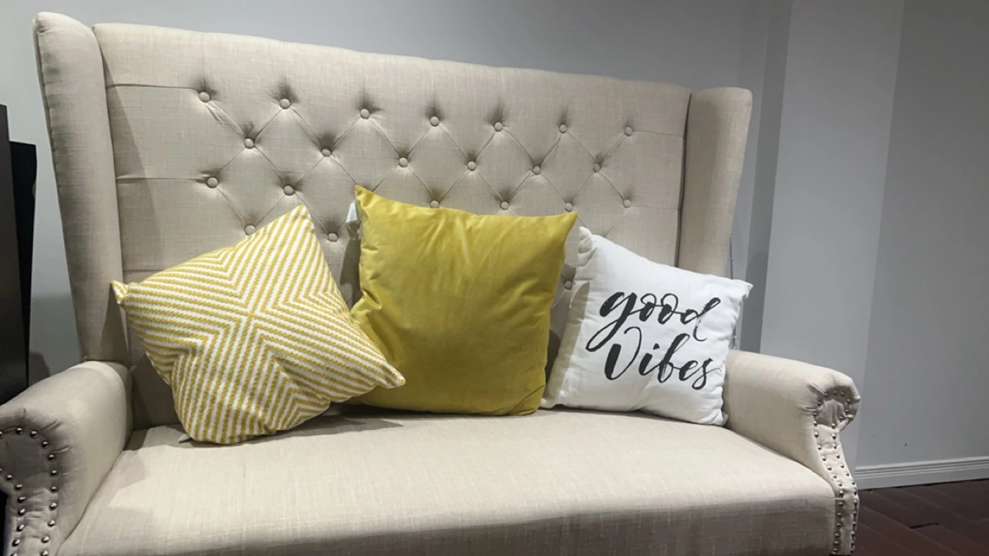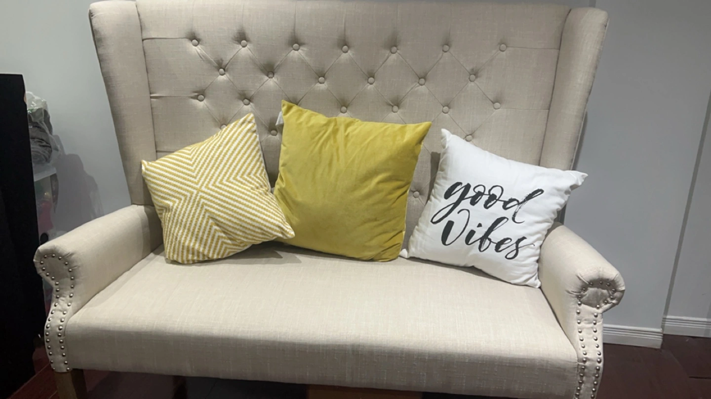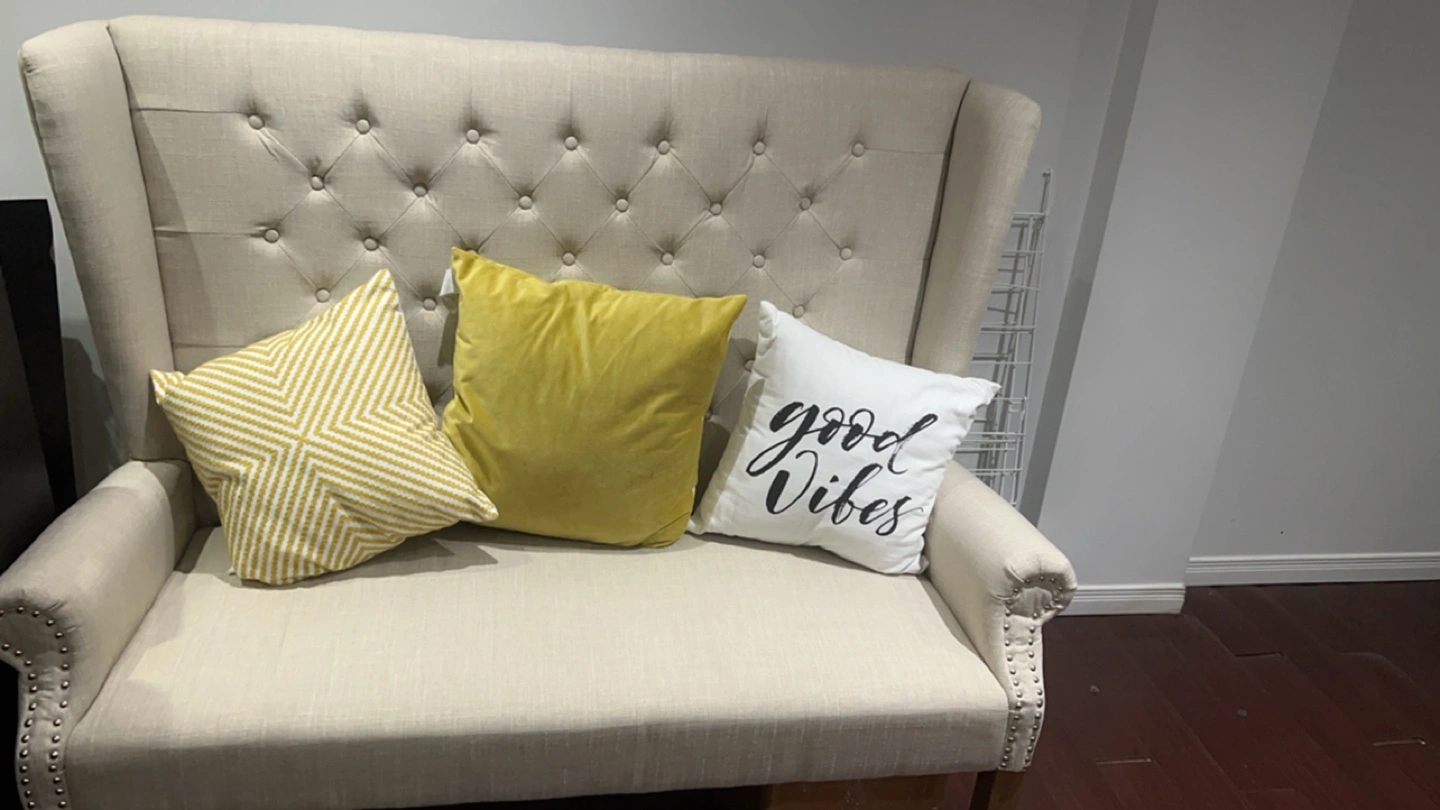 11Elegant beige wingback sofa. Button-tufted design. Brand New never been used. Bought it for a new place and that plan changed. It Includes three throw pillows: two mustard yellow, one white with black lettering. Wooden legs. Great for adding a touch of style to your living room or entryway.
