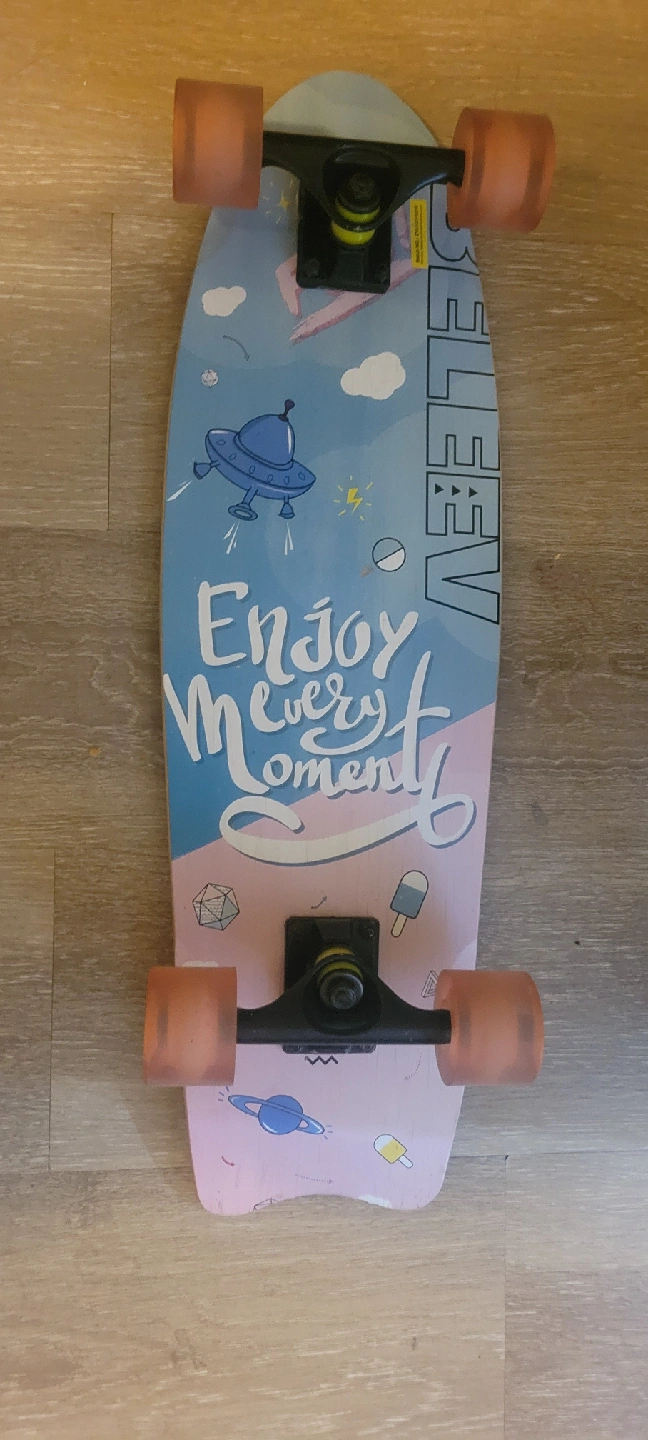 82Get ready to cruise with this Beleev skateboard! It features a fun design with a UFO, planets, and ice cream cones on a pastel background. The wheels are a cool translucent orange. Perfect for enjoying every moment!