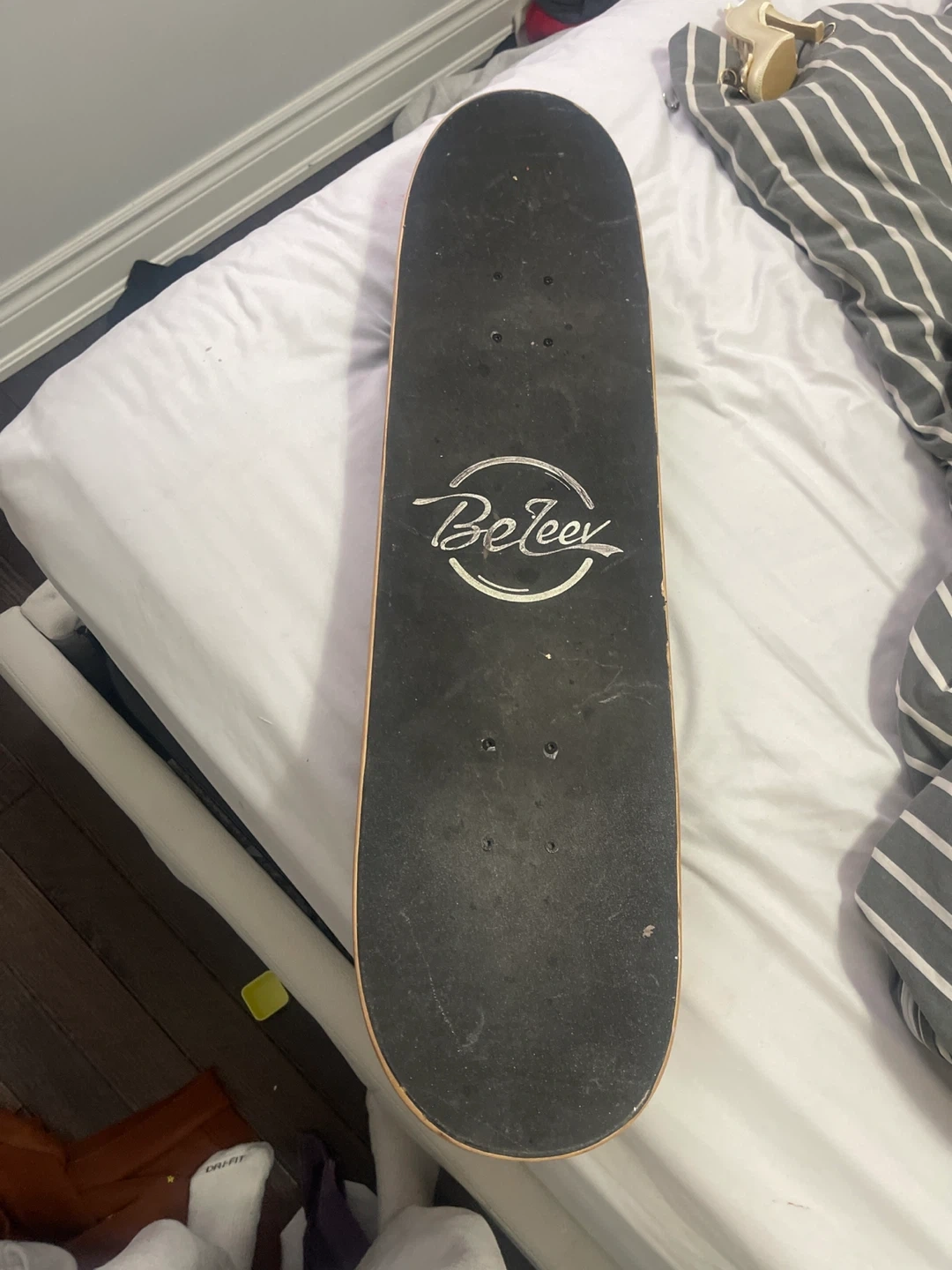 10Selling a Beleev skateboard with a cool blue and white geometric design on the deck and a black grip tape on top. It's in good condition and ready to ride!