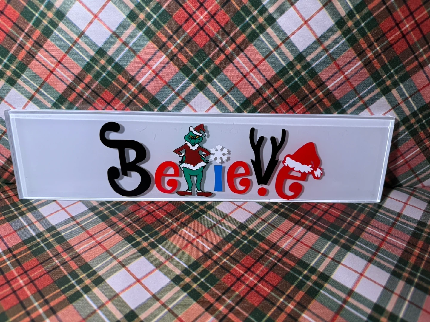 37Cute 'Believe' sign with the Grinch and reindeer antlers. Perfect for adding some holiday cheer to your home! $15 each Pick up south side near southcommon 12 inches by 2.5 inch glass tile