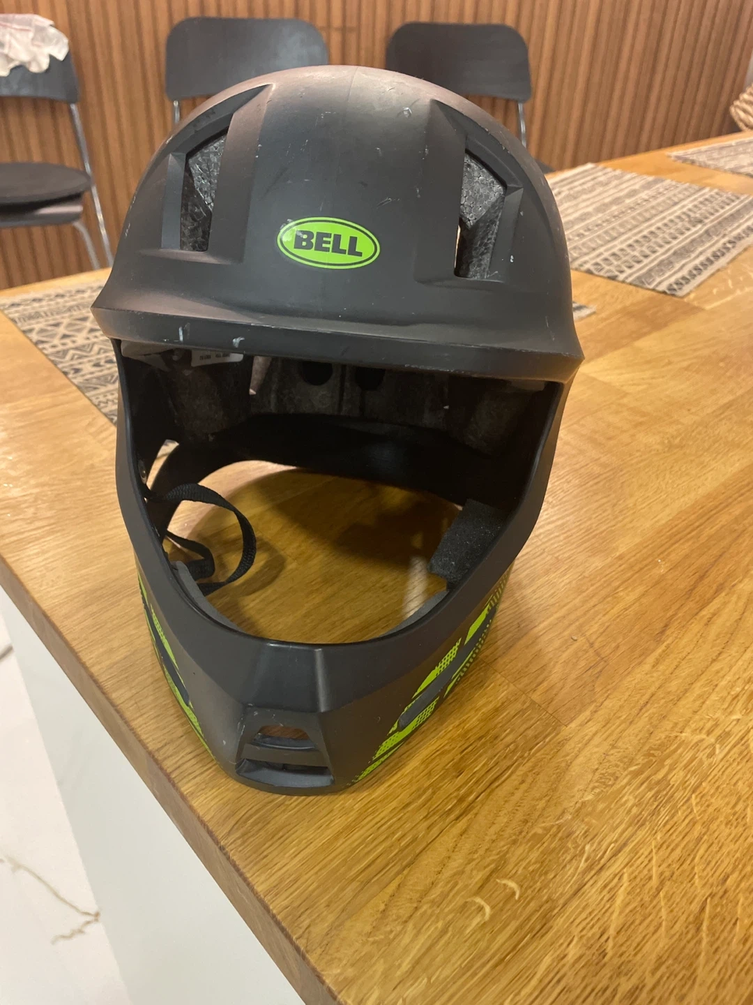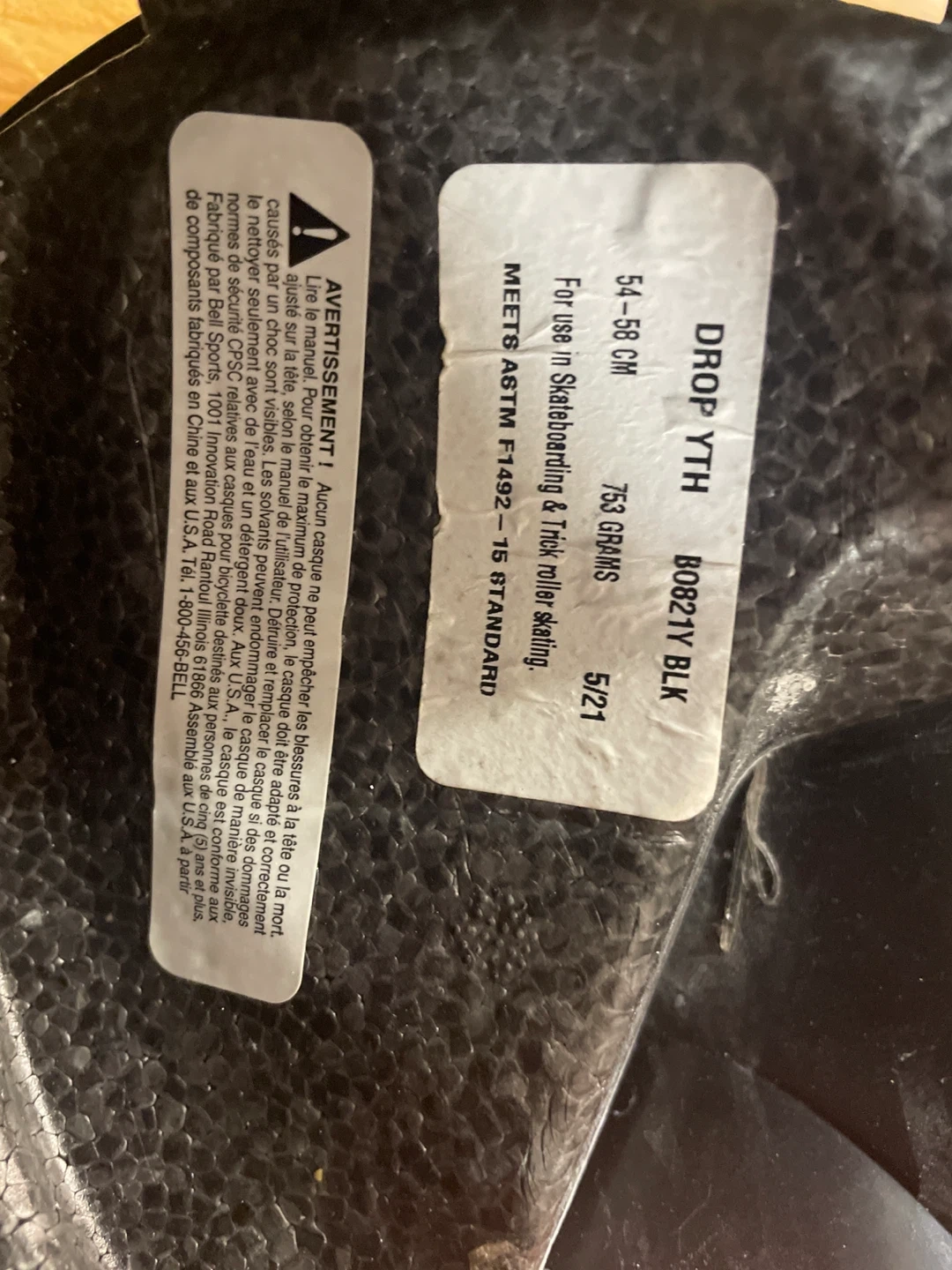 60Selling a Bell Drop YTH youth helmet in black with green accents. It's suitable for skateboarding and trick roller skating. The size is 54-58 cm. It meets ASTM F1492-15 standards. There are some signs of wear.