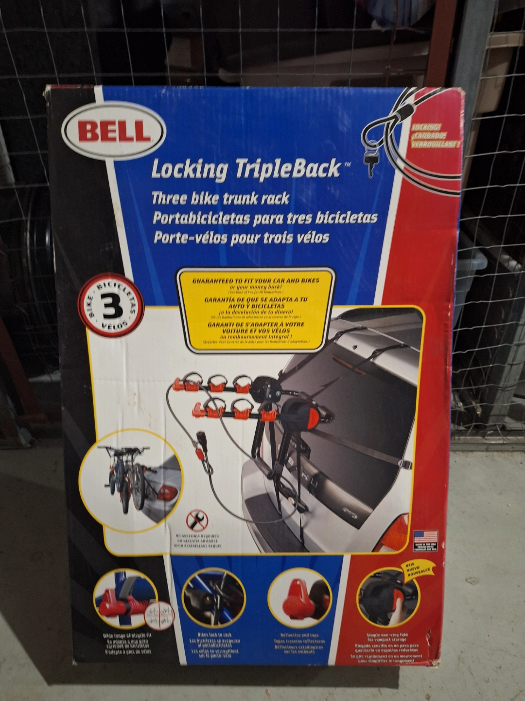 21New in box. Three-bike trunk rack. Guaranteed to fit your car and bikes. Easy to use, folds for compact storage. Includes reflectors. $60.00 or best offer