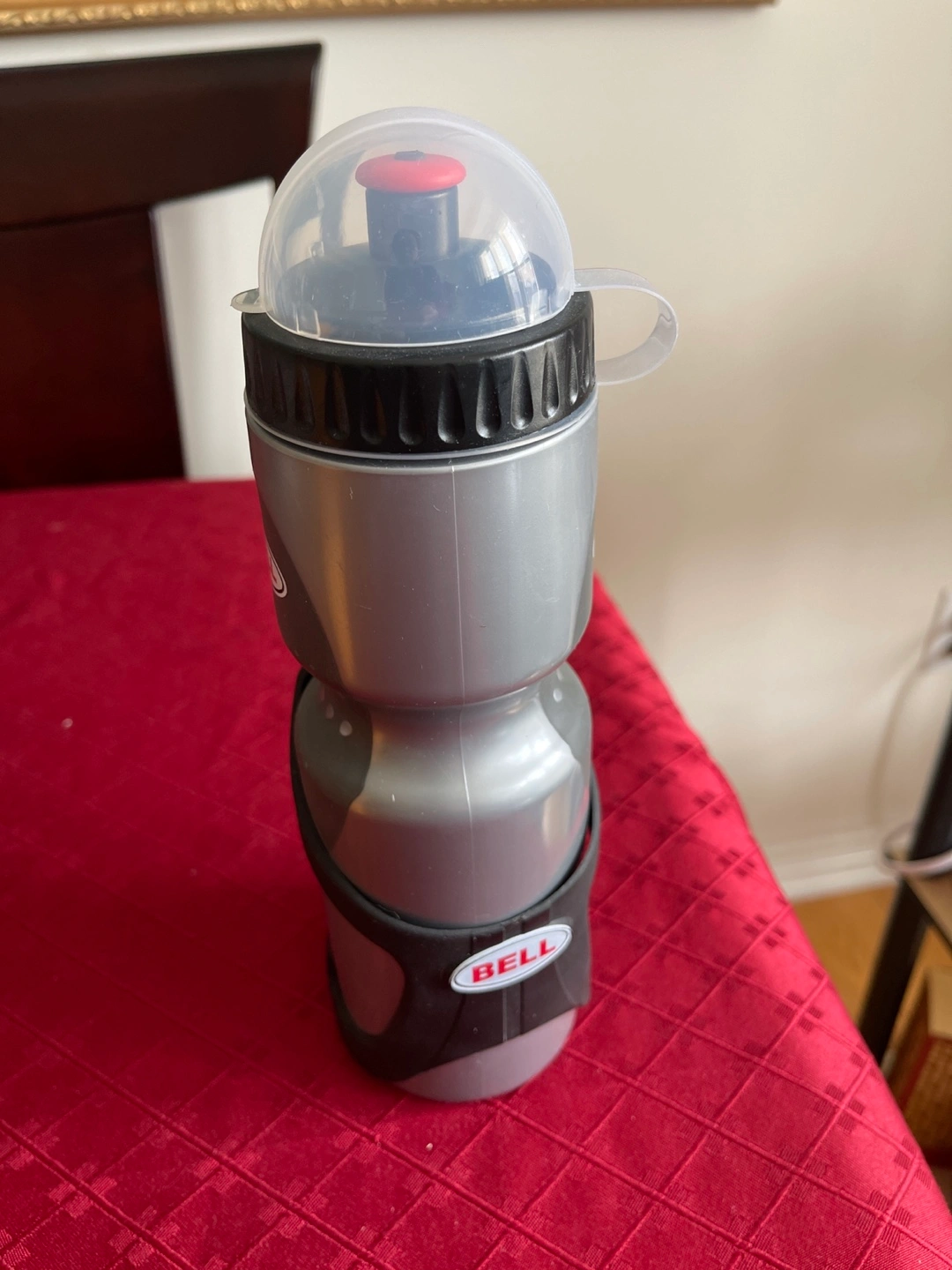 37Grey cycling water bottle. Features a clear top and a black carrying strap. Good for hydration during cycling. Only available for pick up.