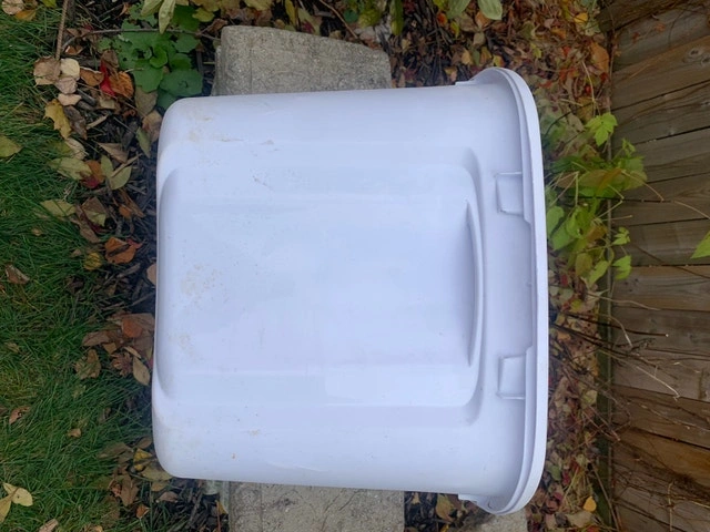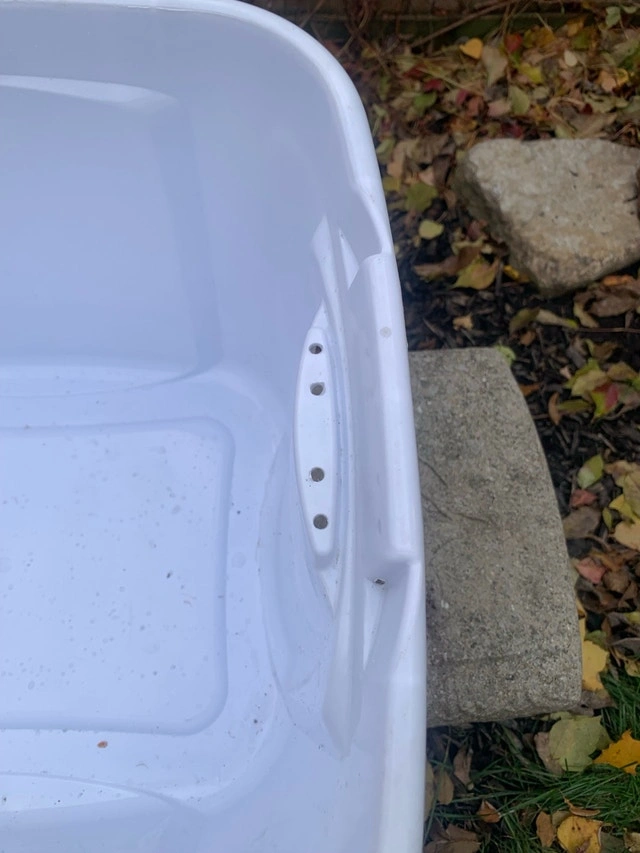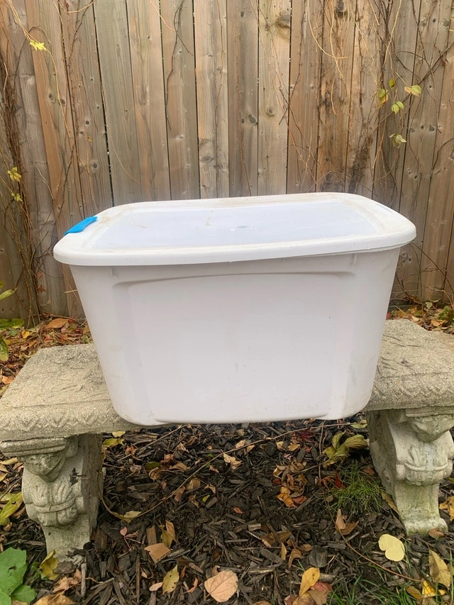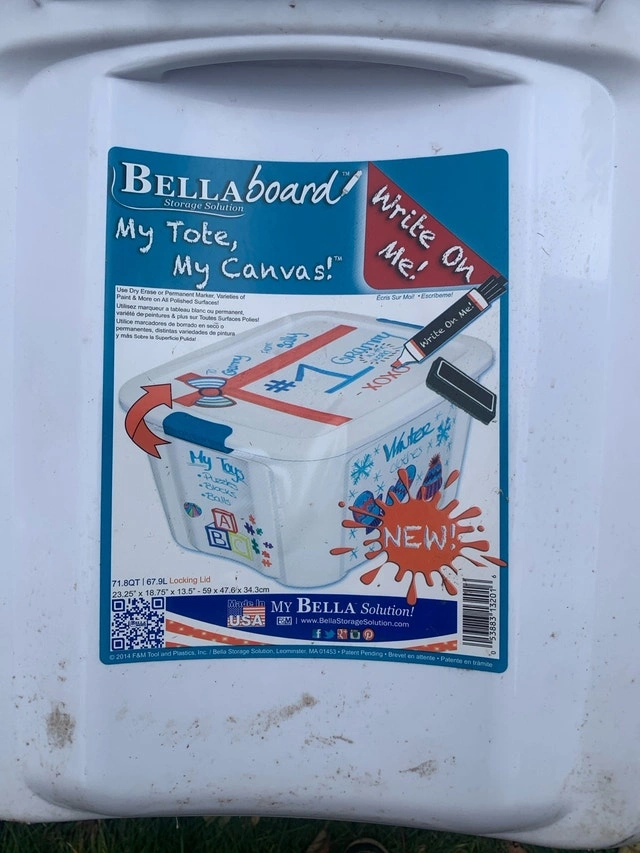 80This is a used Bella Storage Solution tote with a whiteboard surface, perfect for organizing and labeling your items with dry erase markers. It's in fair condition and is missing one of the latches but the lid fits fine. Durable plastic construction and write-on surface with blue accents. Looking for a home where it'll be appreciated! If the ad's up, it's still available.