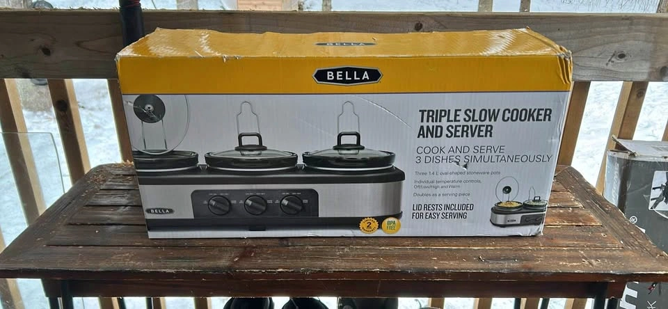 15BELLA Triple Slow Cooker 3 x 1.5 QT brand new never used still in packaging but can’t return it; the box has too much wear on it from moving to return it. Asking 60 for it.