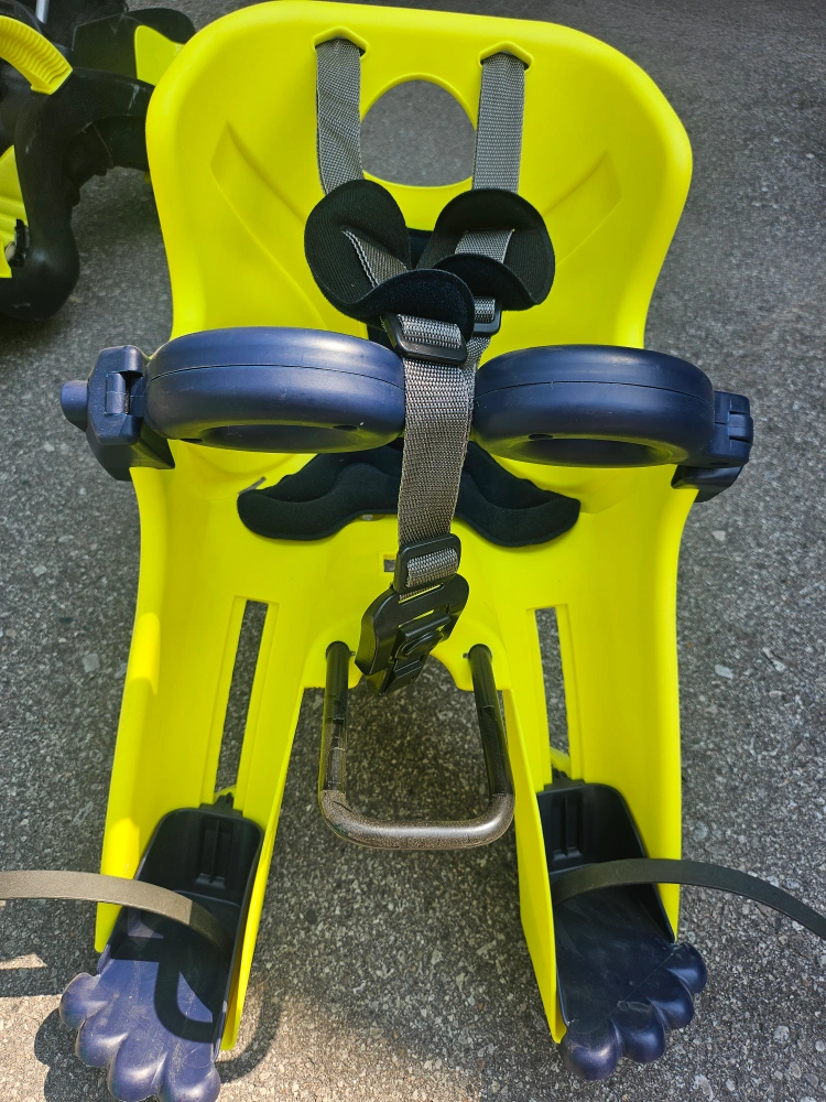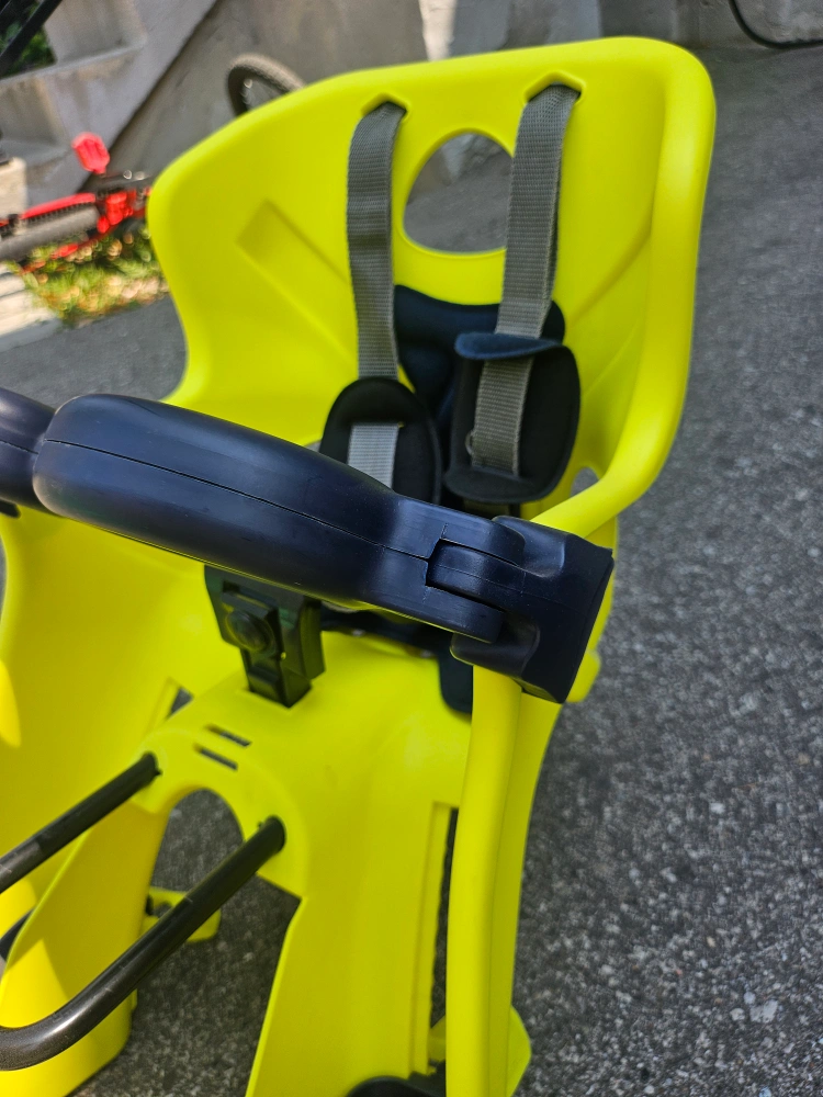 Selling a Bellelli Freccia child bike seat in a vibrant yellow colour. It's designed to carry a maximum weight of 15 kg. Perfect for taking your little one on bike rides around town! https://a.co/d/cYdKILN Safety First: The Bellelli Freccia is designed to keep children safe. Features include high side rails, front handle and a 3 point safety belt to keep your child secure throughout the ride. Comfort: Large vent holes in the rear and a soft, washable cushion ensure for a comfortable ride from start to finish. Adjustability: Both the feet and safety belt are adjustable making this model able to be used for multiple years. Mounting: The Freccia is compatible with bikes from 26 to 28 inch wheels. The mount attaches to the headset with the standard B-Fix system. The B-Fix system works on bikes with up to 45 mm diameter headtubes and a gap is requires between the top tube and downtube for proper fixation. Capacity: This model supports children up to 33 lbs (15 kg) with a recommend an age of 2-5. Exceeding the weight limit is not allowed.