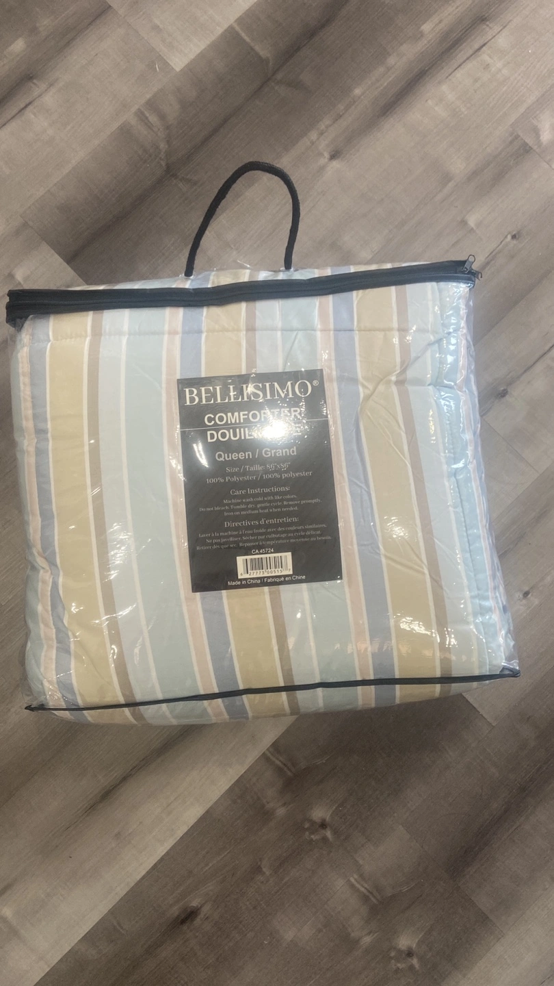 Selling a brand new Bellisimo comforter, still in its original packaging! This is a Queen/Grand size comforter, measuring 86" x 86". It's made of 100% polyester and features a lovely striped pattern. Easy care instructions: machine wash cold with like colours, tumble dry on gentle cycle, and iron on medium heat if needed