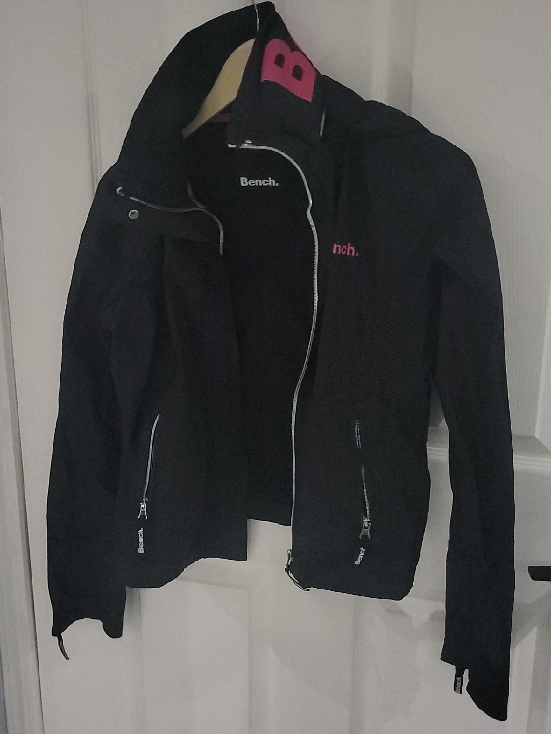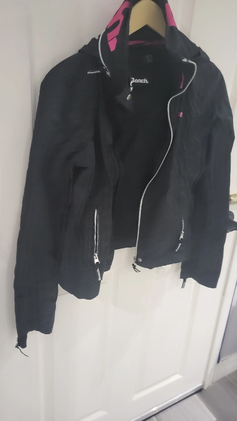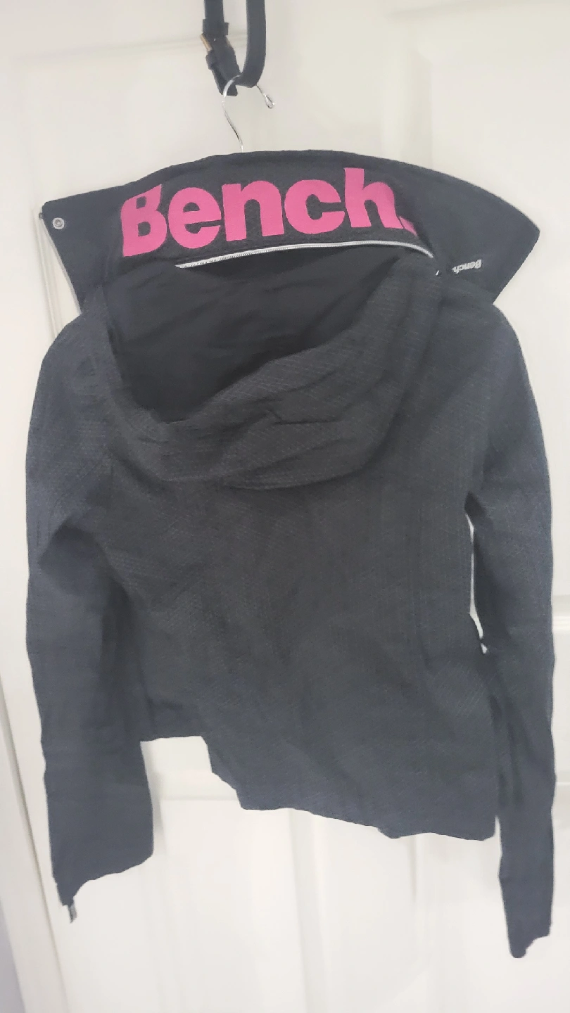 Bench jacket in black and pink. It's in great condition . The jacket features a hood and zipper pockets.