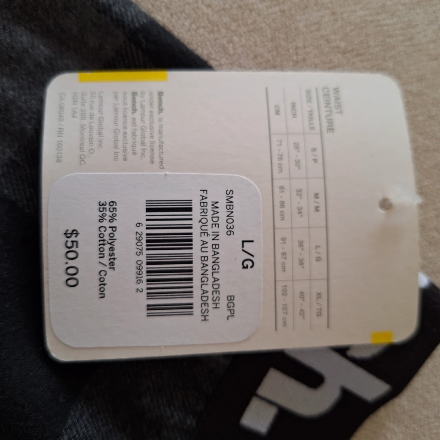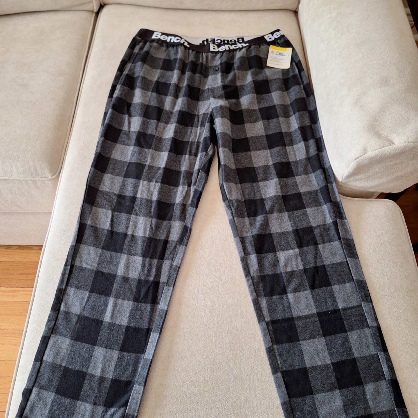 68Bench flannel pants in a black and grey plaid pattern, size large. They're made of 65% polyester and 35% cotton. Originally bought for $50.00!