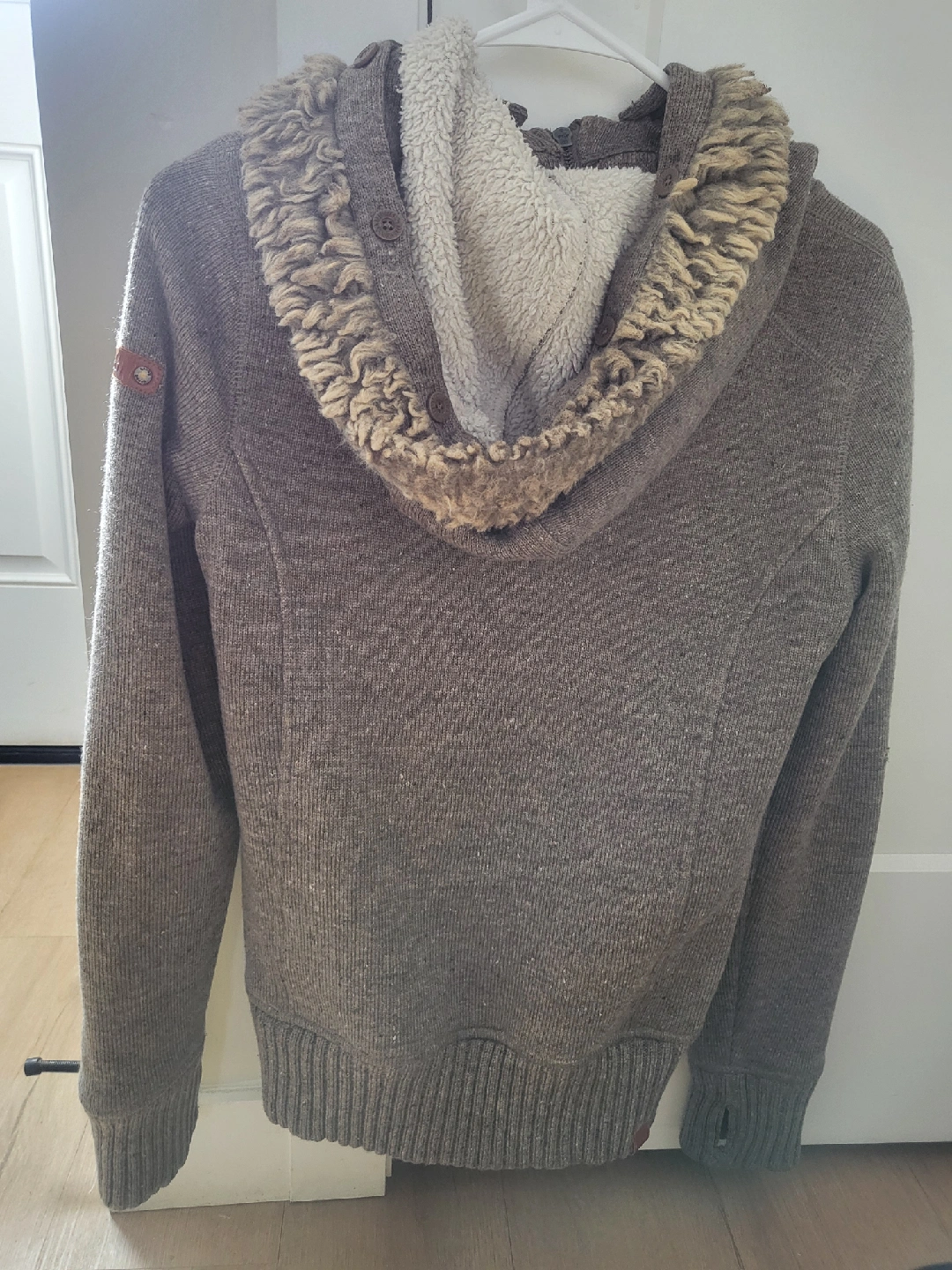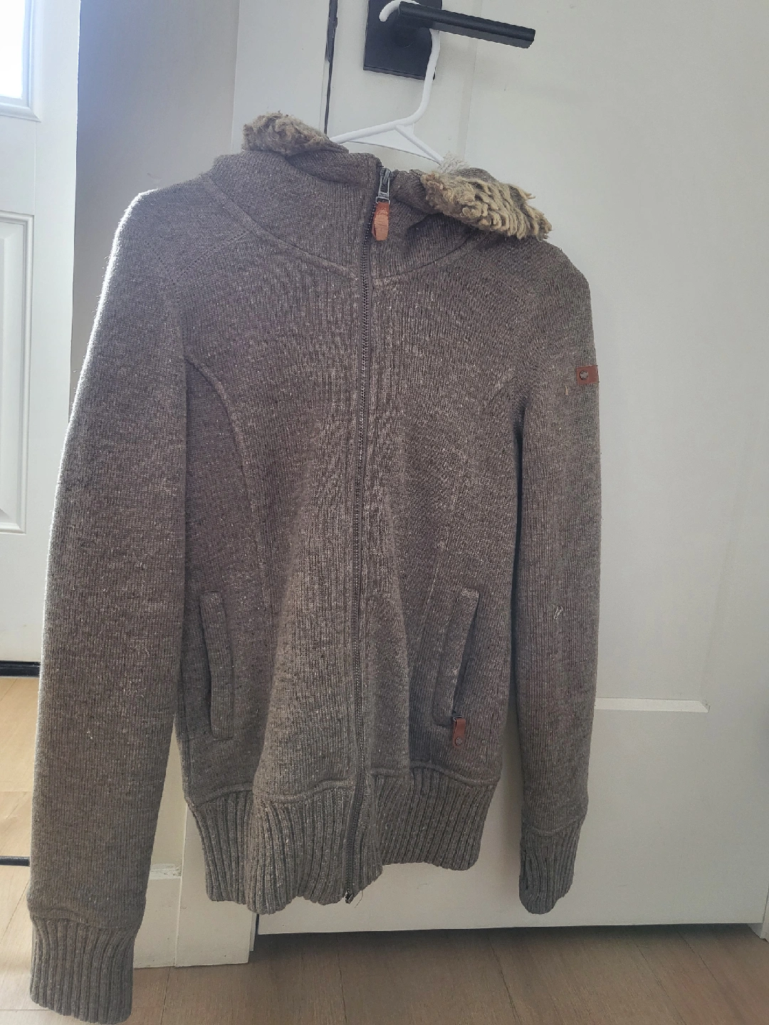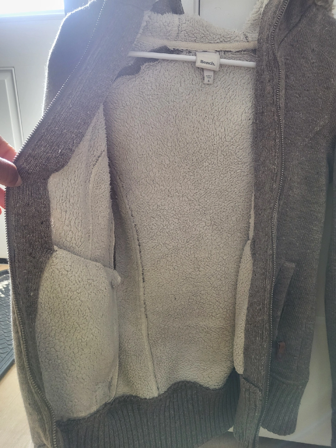 Cozy Bench. zip-up hoodie in a neutral grey knit! It's a size small and features a super soft, plush lining, perfect for staying warm on chilly days. The hood has a faux fur trim for extra style and warmth. Great for layering!