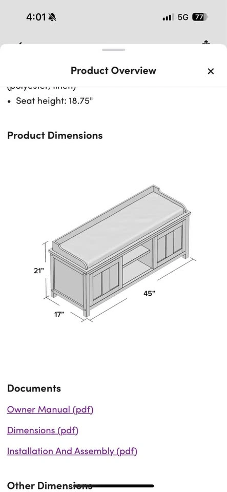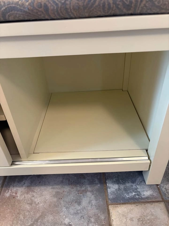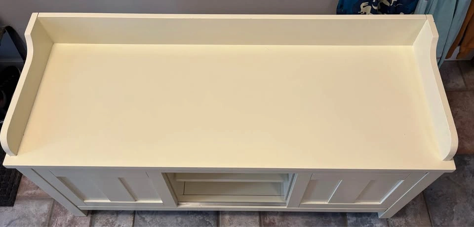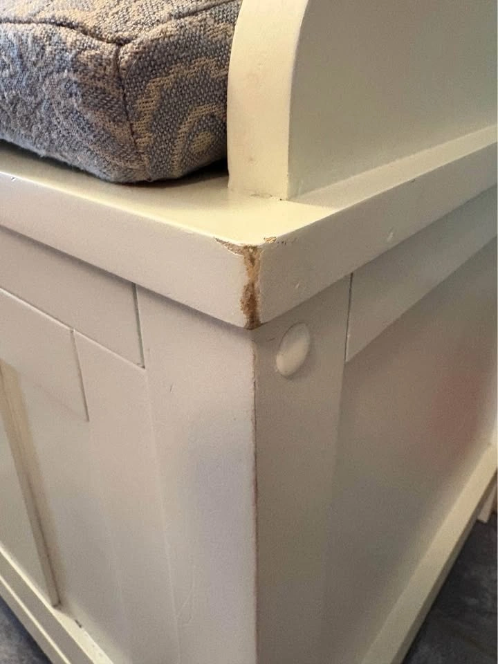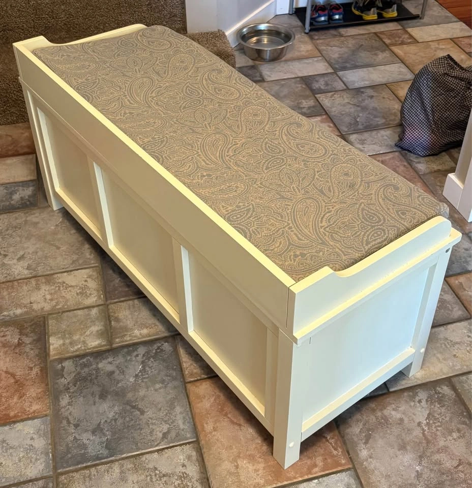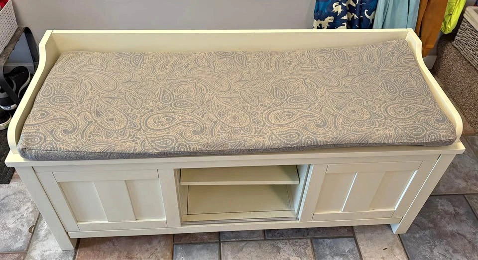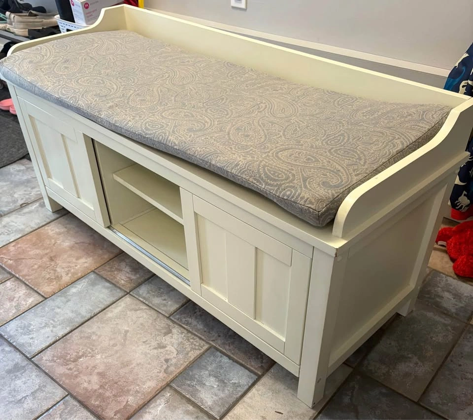 Used in front entry, in good condition. Some wear and tear - see pictures. Just washed the cushion cover so it’s ready to go. Dimensions in photos. Link below to where we bought it from for more information. https://www.wayfair.ca/furniture/pdp/three-posts-lebow-storage-bench-bchh8144.html Lebow Upholstered Storage Bench