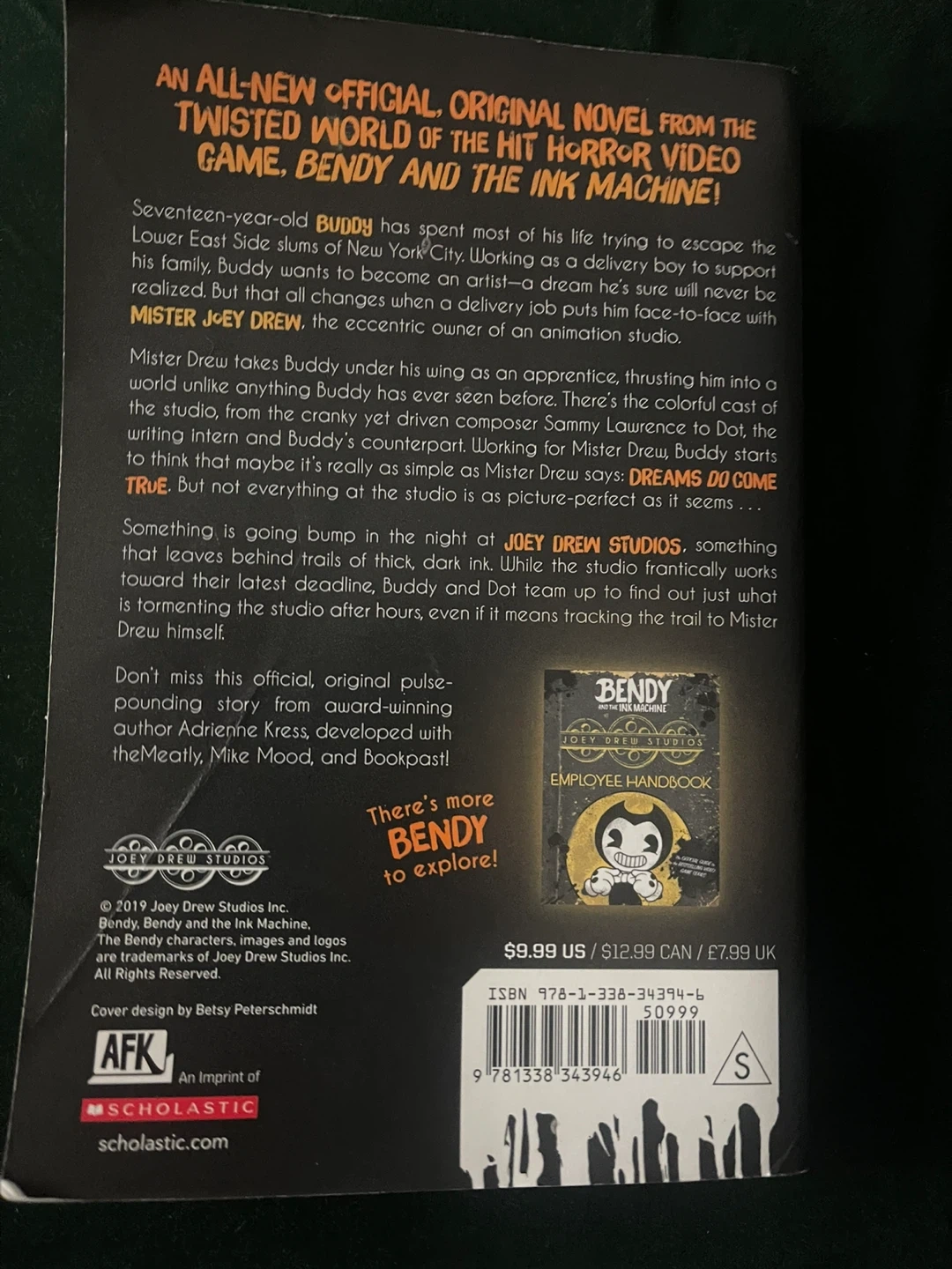Selling the novel Bendy and the Ink Machine: Dreams Come to Life by Adrienne Kress. It's an original novel from the twisted world of the hit horror video game. Perfect for fans of the game or anyone who enjoys a spooky read!