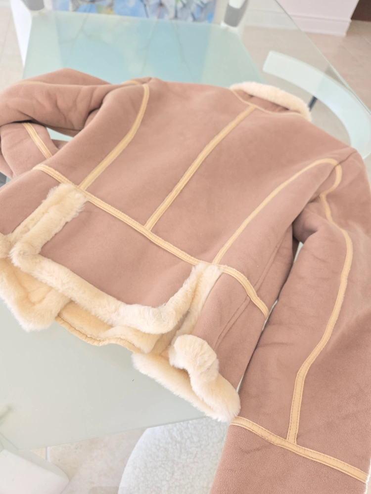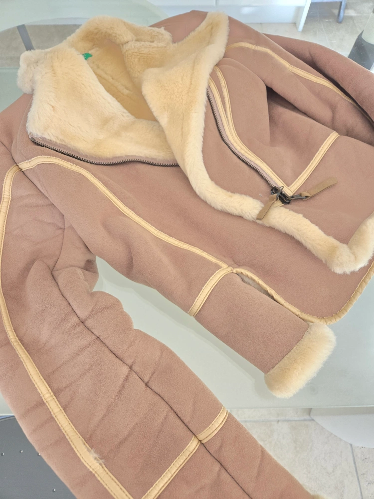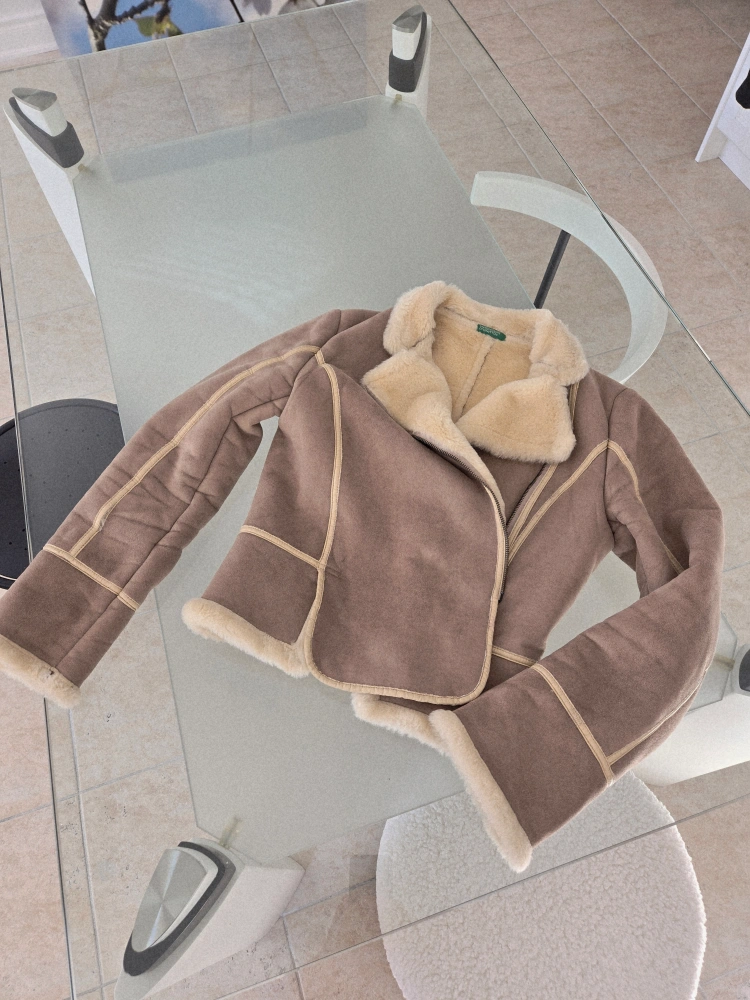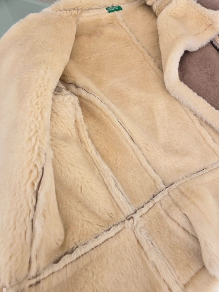 Cozy Benetton shearling jacket in a lovely neutral colour. Perfect for adding a touch of warmth and style to your outfit!