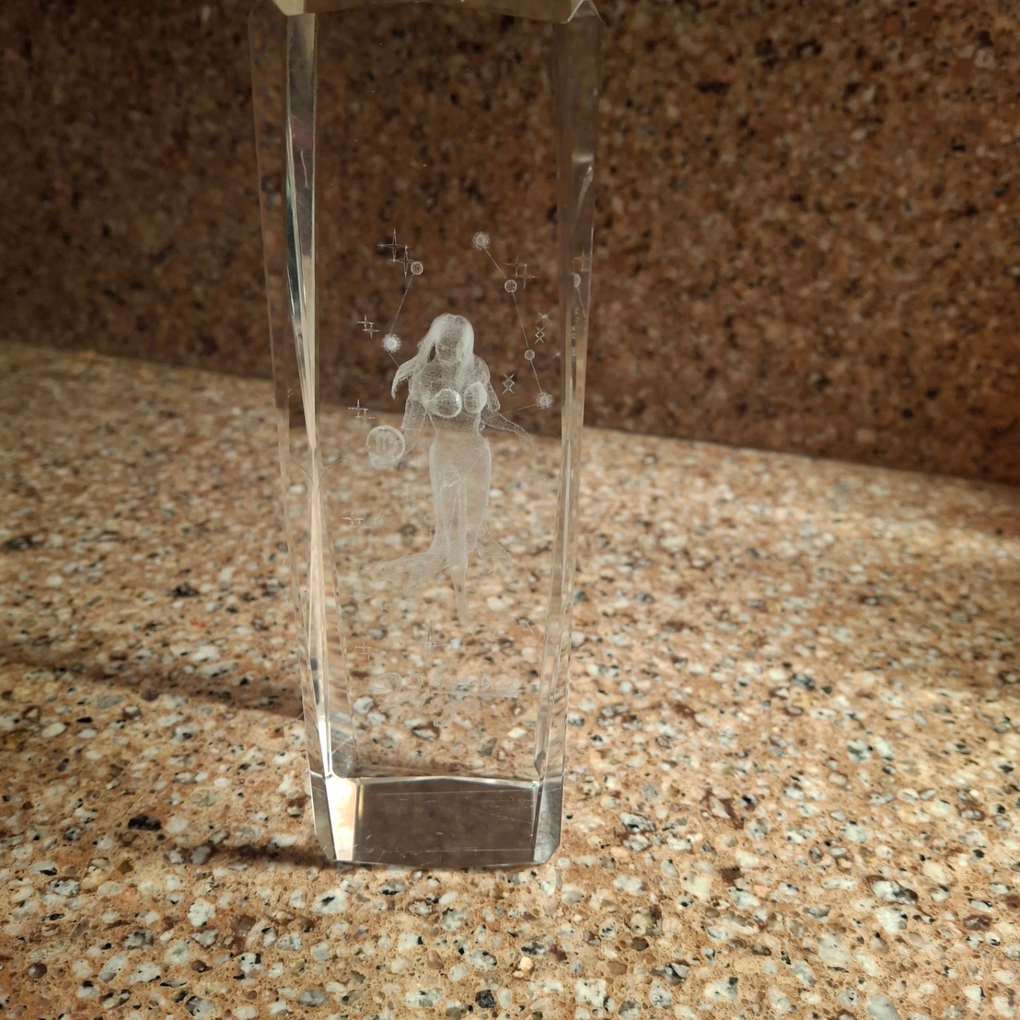 This crystal figurine features an etched design of the Virgo zodiac sign with constellations. It also displays the dates August 24th to September 23rd. Adds a touch of celestial elegance to any space.