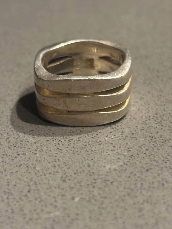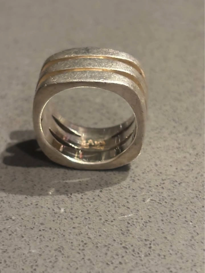 • Design: Wide, modern band with brushed silver finish, cutout grooves inside for comfort and reduced weight, and polished gold accents