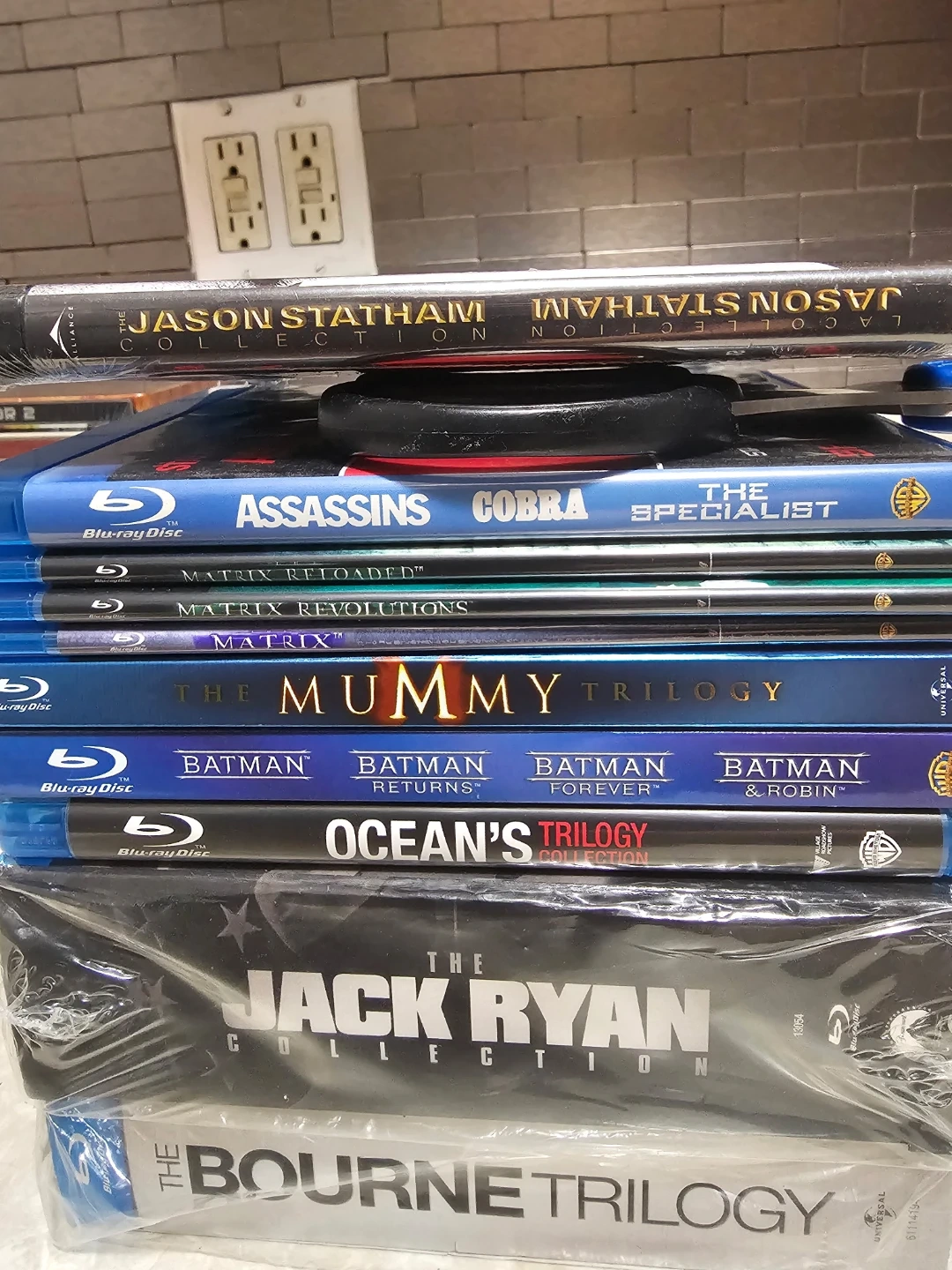 Collection of Blu-ray movies including the Jason Statham Collection, The Mummy Trilogy, Batman series, Ocean's Trilogy, Jack Ryan Collection, and The Bourne Trilogy. All appear to be in standard Blu-ray cases.