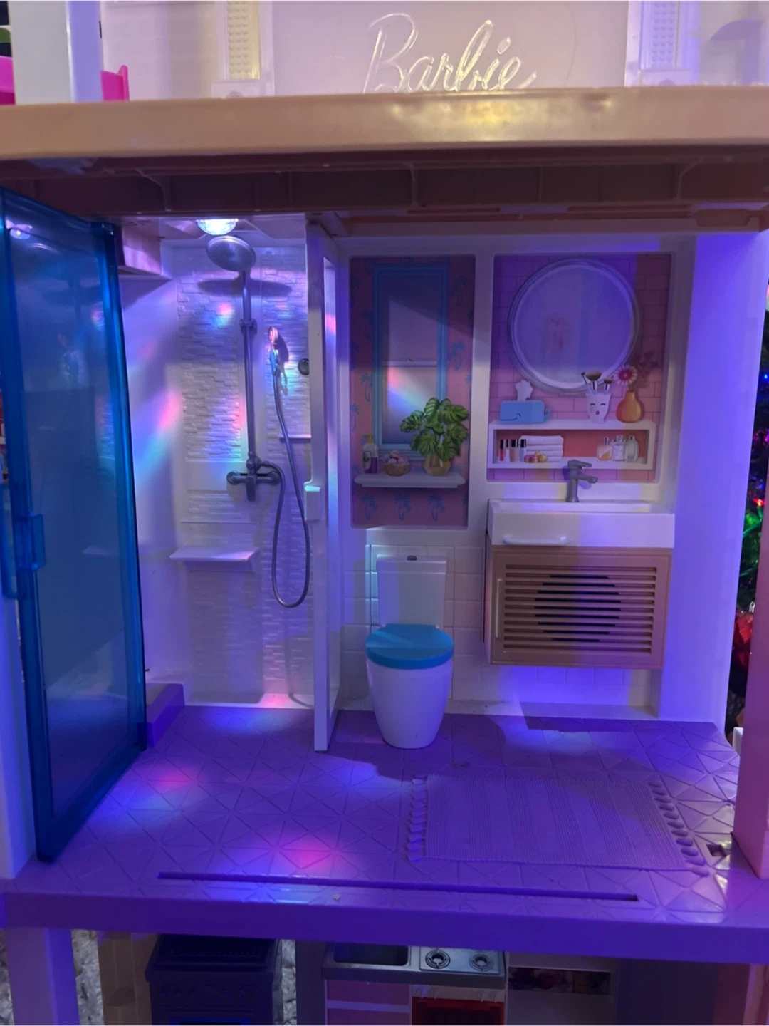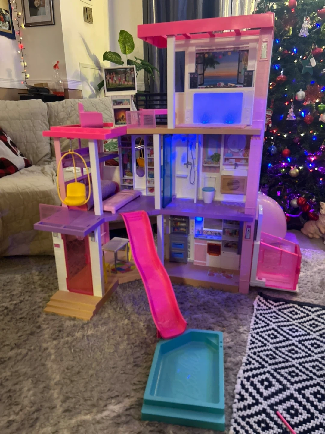 This is a large Barbie Dreamhouse dollhouse with multiple levels and rooms. It includes furniture like a bed, couch, toilet, sink, shower, refrigerator, and oven. The dollhouse also features a slide and a pool attachment, offering lots of play possibilities! It's perfect for imaginative play sessions.