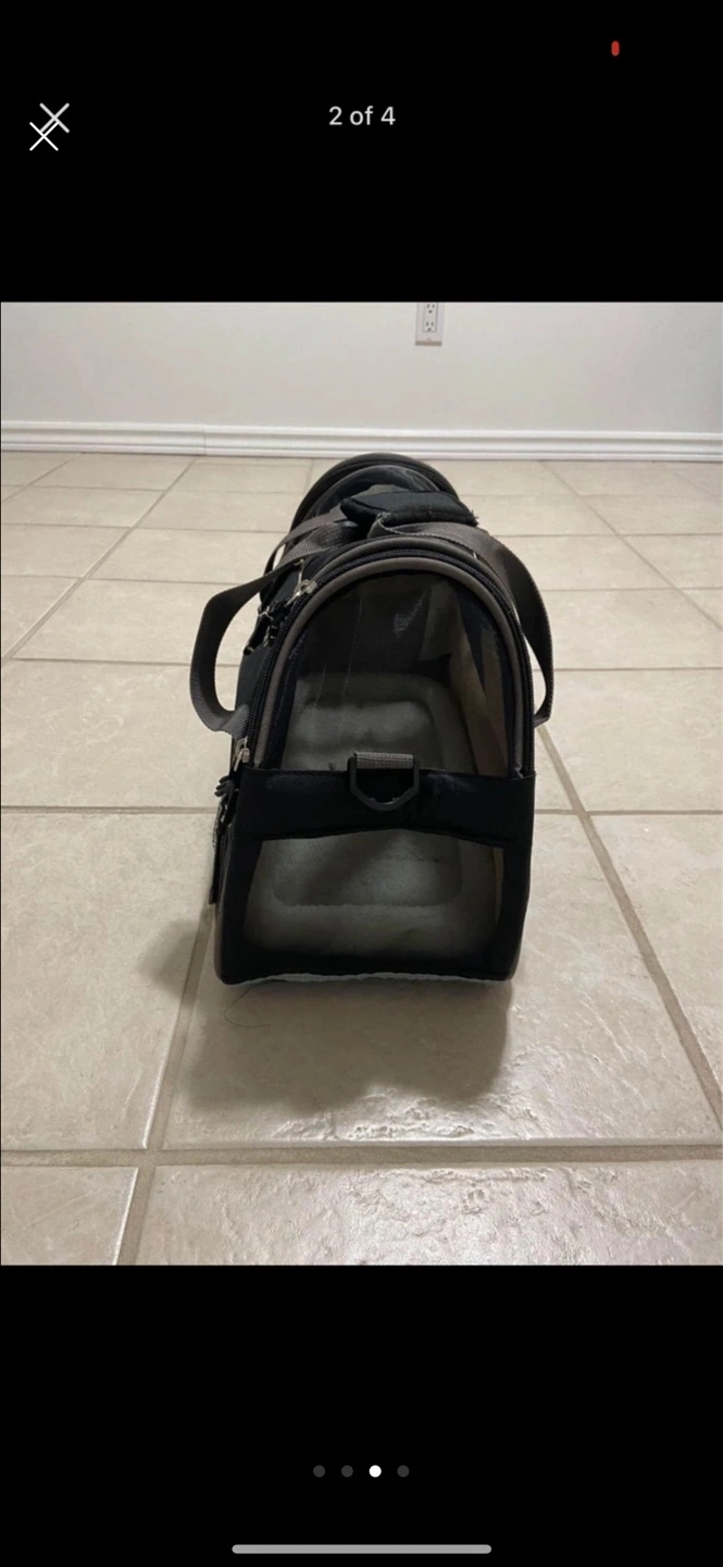 24Small pet carrier. Black and grey. Mesh sides. Soft interior. Suitable for cats or small dogs. Top handle and shoulder strap. Only used once!! Brand new condition. Airline approved size- 16”L x 8” W x 11” Ht