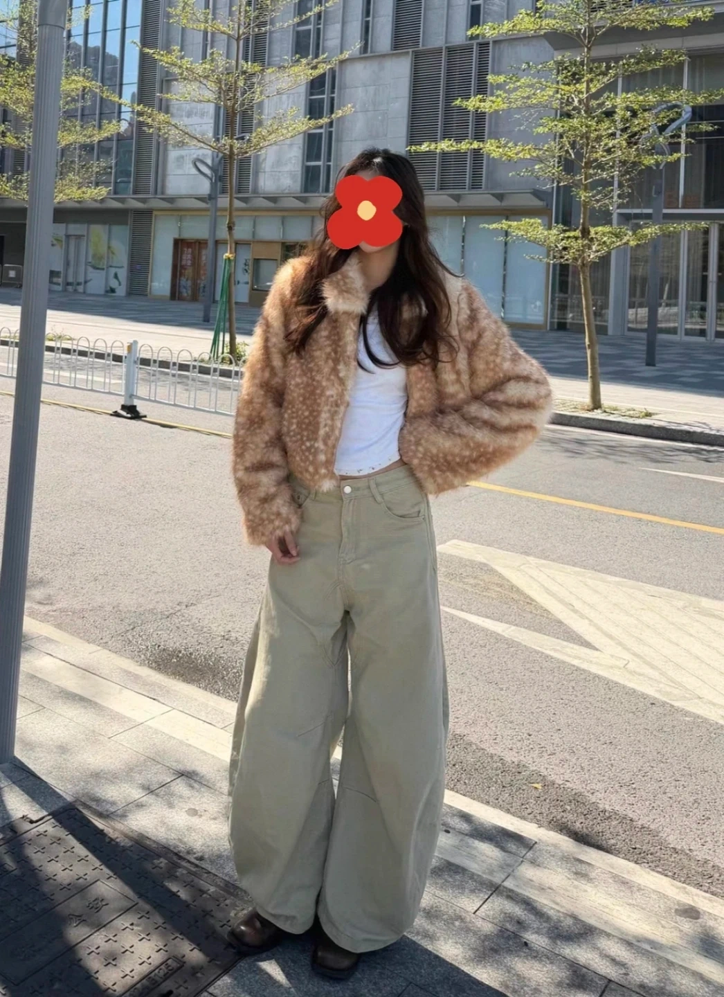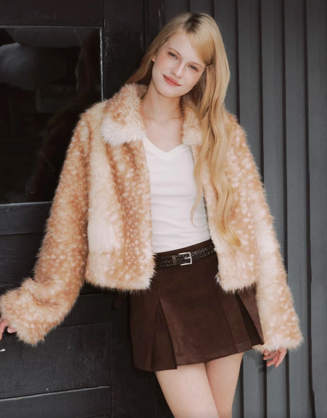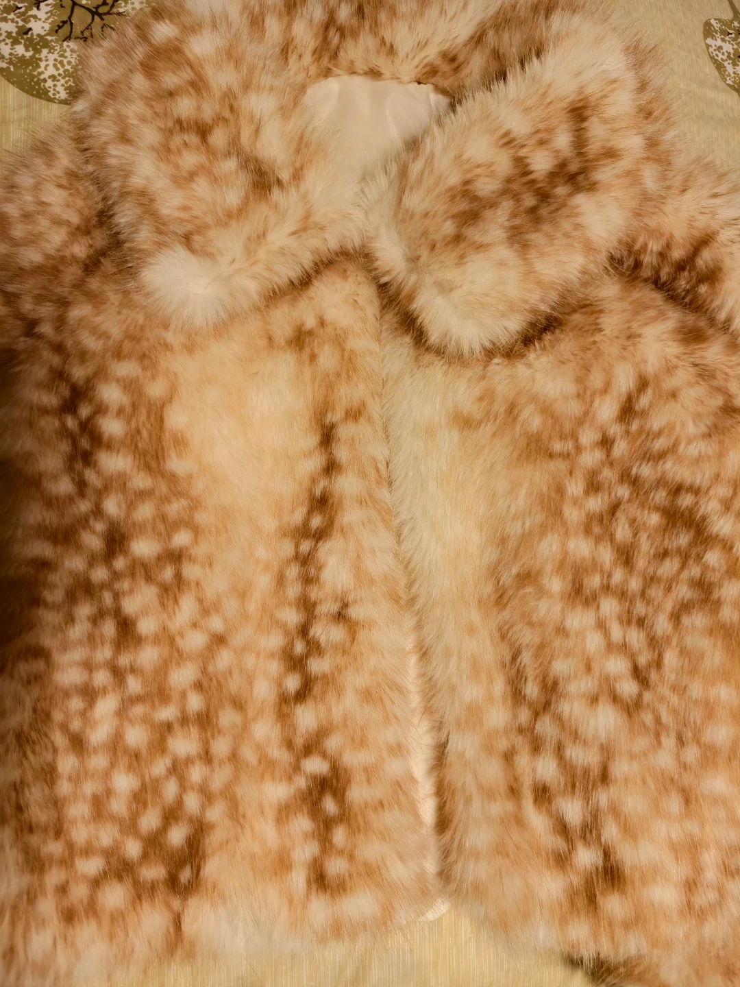 Like New. Super soft and fluffy faux fur cropped jacket with a relaxed fit. Fawn color pairs well with casual and dressy looks. Very easy to layer and style. Hook style closure. Oversized, can fit S-L. PTP-20"