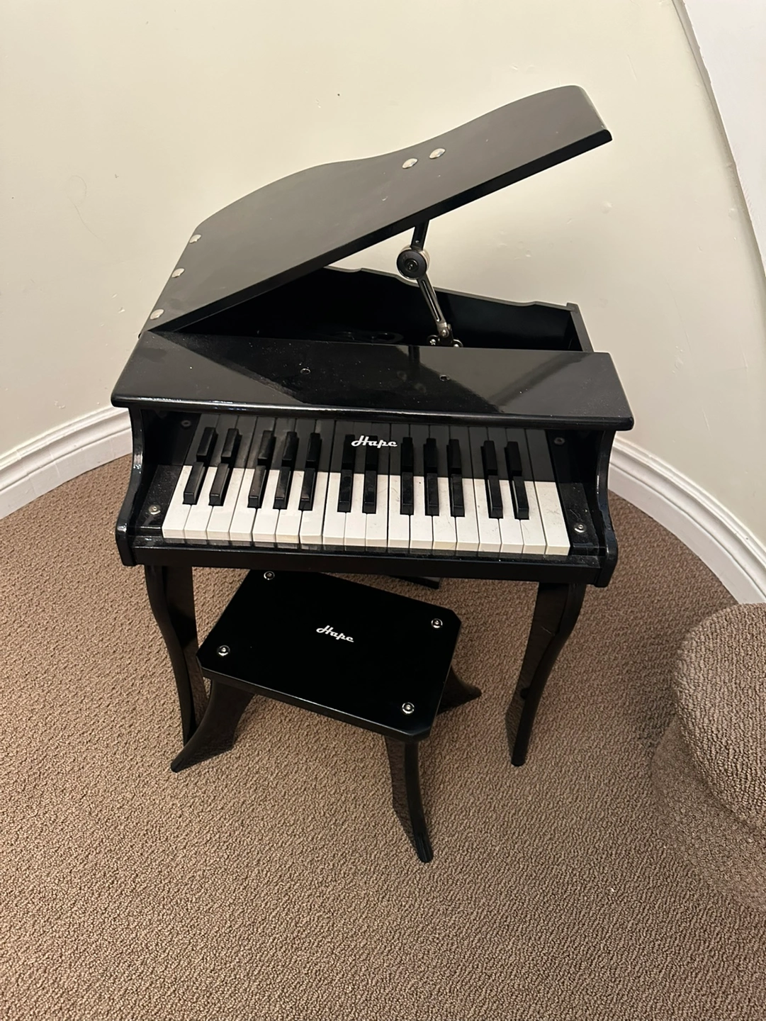 Black Hape wooden grand piano and matching stool for kids. Features 30 keys. This toy piano is great for introducing little ones to music!