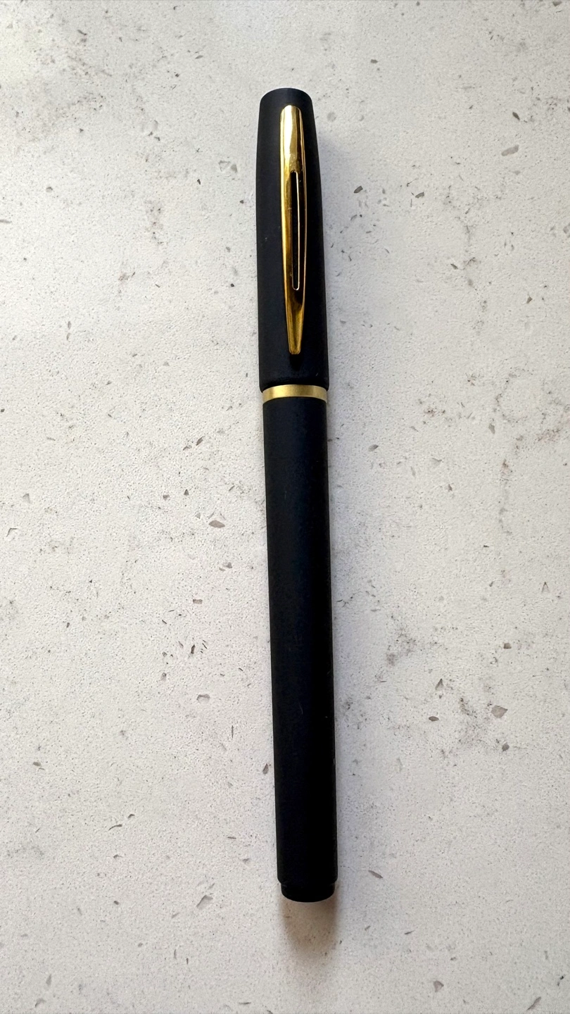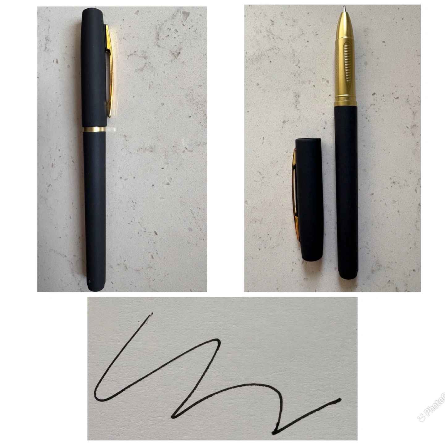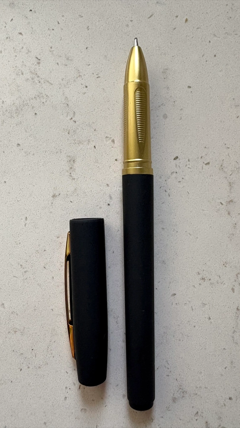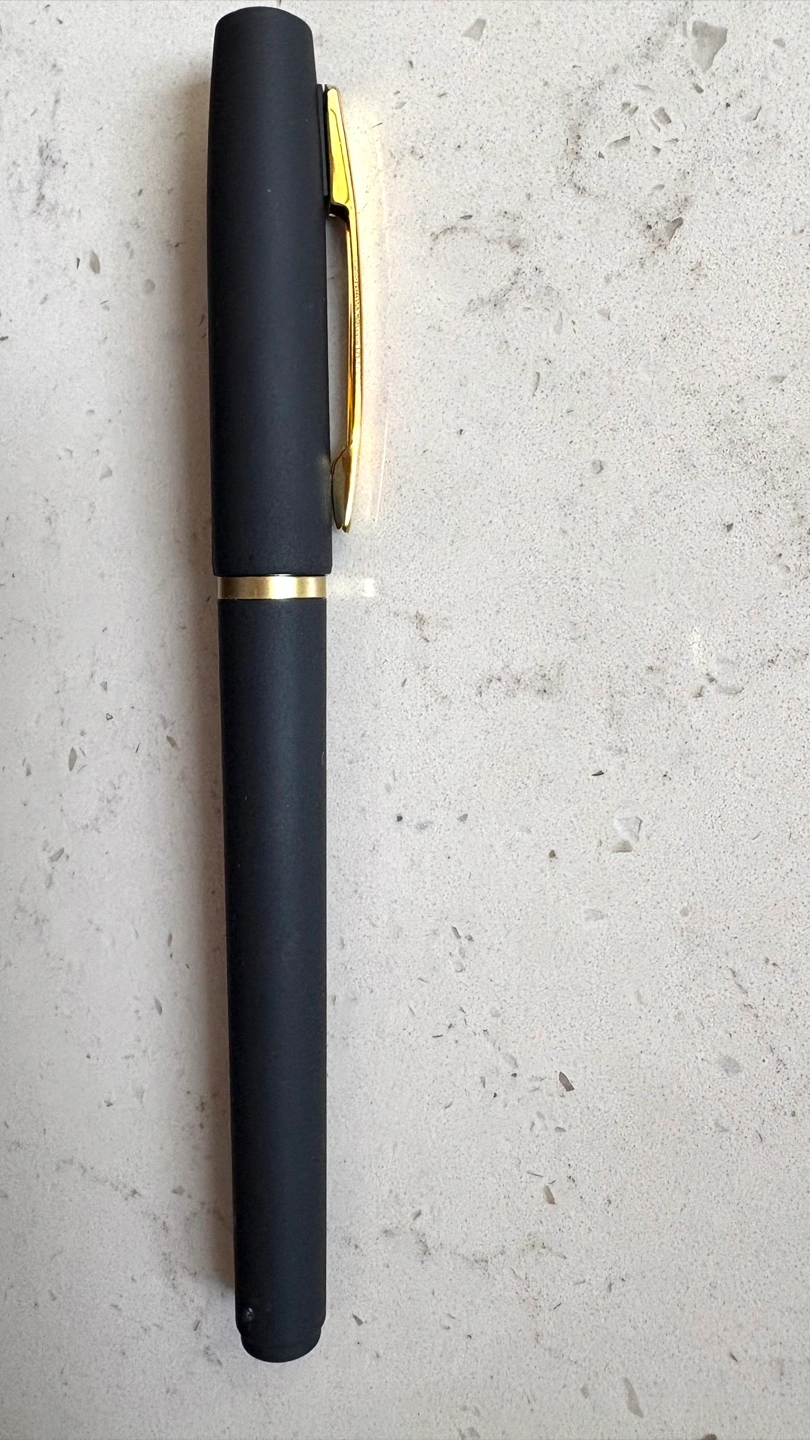 Selling a sleek black pen with gold accents! It's in great shape and writes smoothly. Perfect for adding a touch of elegance to your writing. You will love this pen if you write a lot at your job , best pen that I ever had. 0.7mm Large capacity 3x normal size . New Refill at 0.50 cent each available .