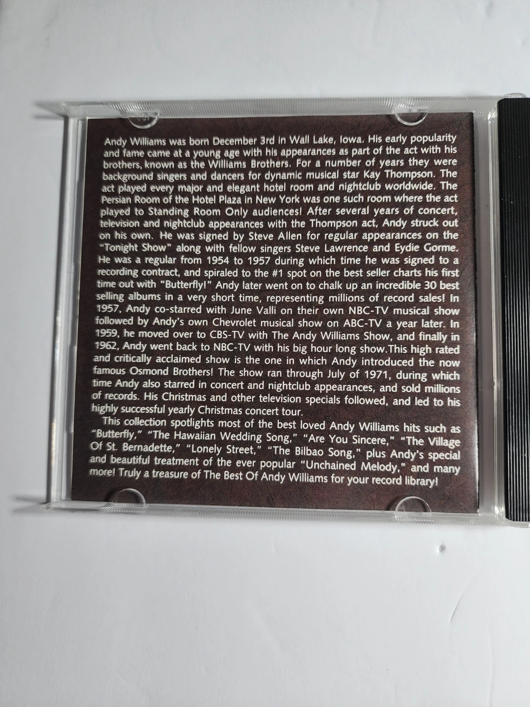 137Selling a Best of Andy Williams CD. Includes original recordings like "The Hawaiian Wedding Song" and "Canadian Sunset".