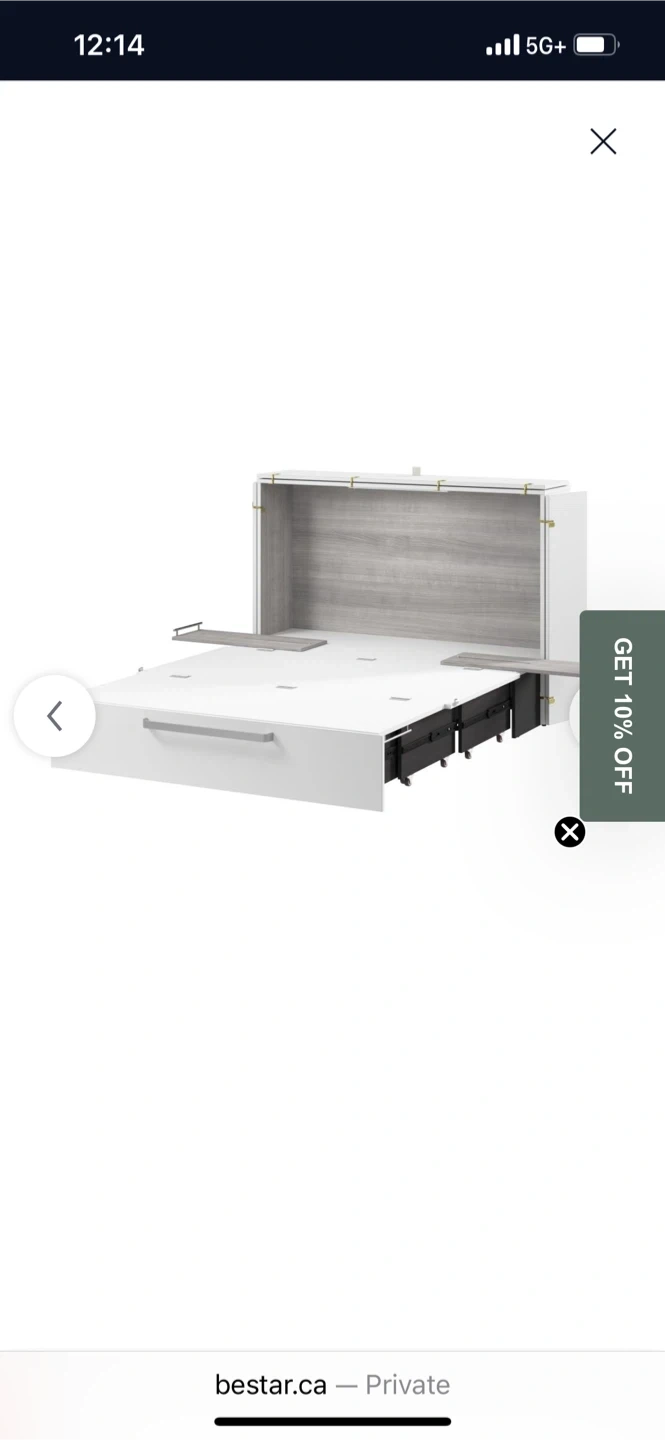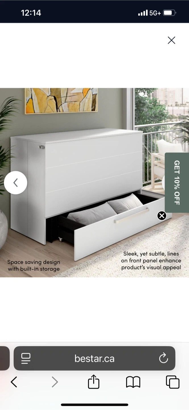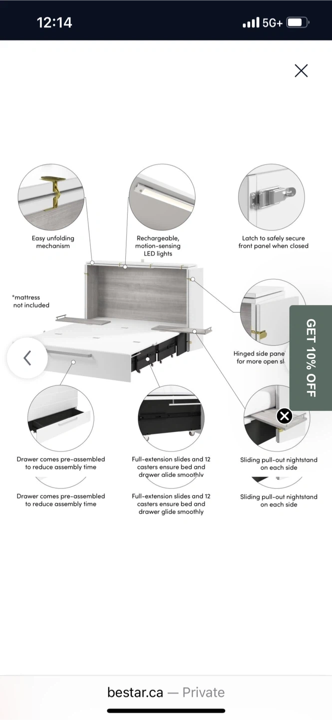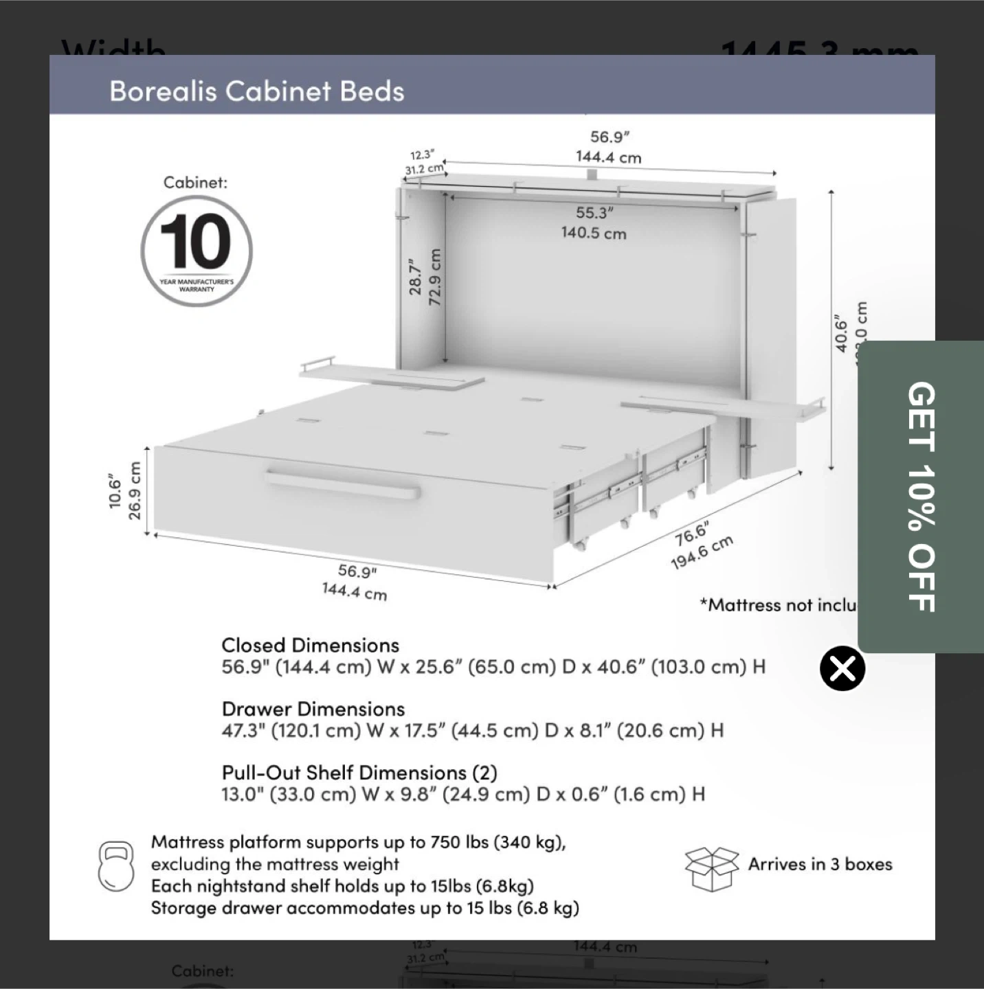 Selling a Bestar Borealis Cabinet Bed in great condition! - Space-saving design with built-in storage - Rechargeable, motion-sensing LED lights - Two pull-out nightstand shelves - Easy unfolding mechanism - Full-extension slides and 12 casters ensure bed and drawer glide smoothly - Closed Dimensions: 56.9"W x 25.6"D x 40.6"H - Drawer Dimensions: 47.3"W x 17.5"D x 8.1"H - Pull-Out Shelf Dimensions (2): 13.0"W x 9.8"D x 0.6"H - Mattress platform supports up to 750 lbs (340 kg), excluding the mattress weight