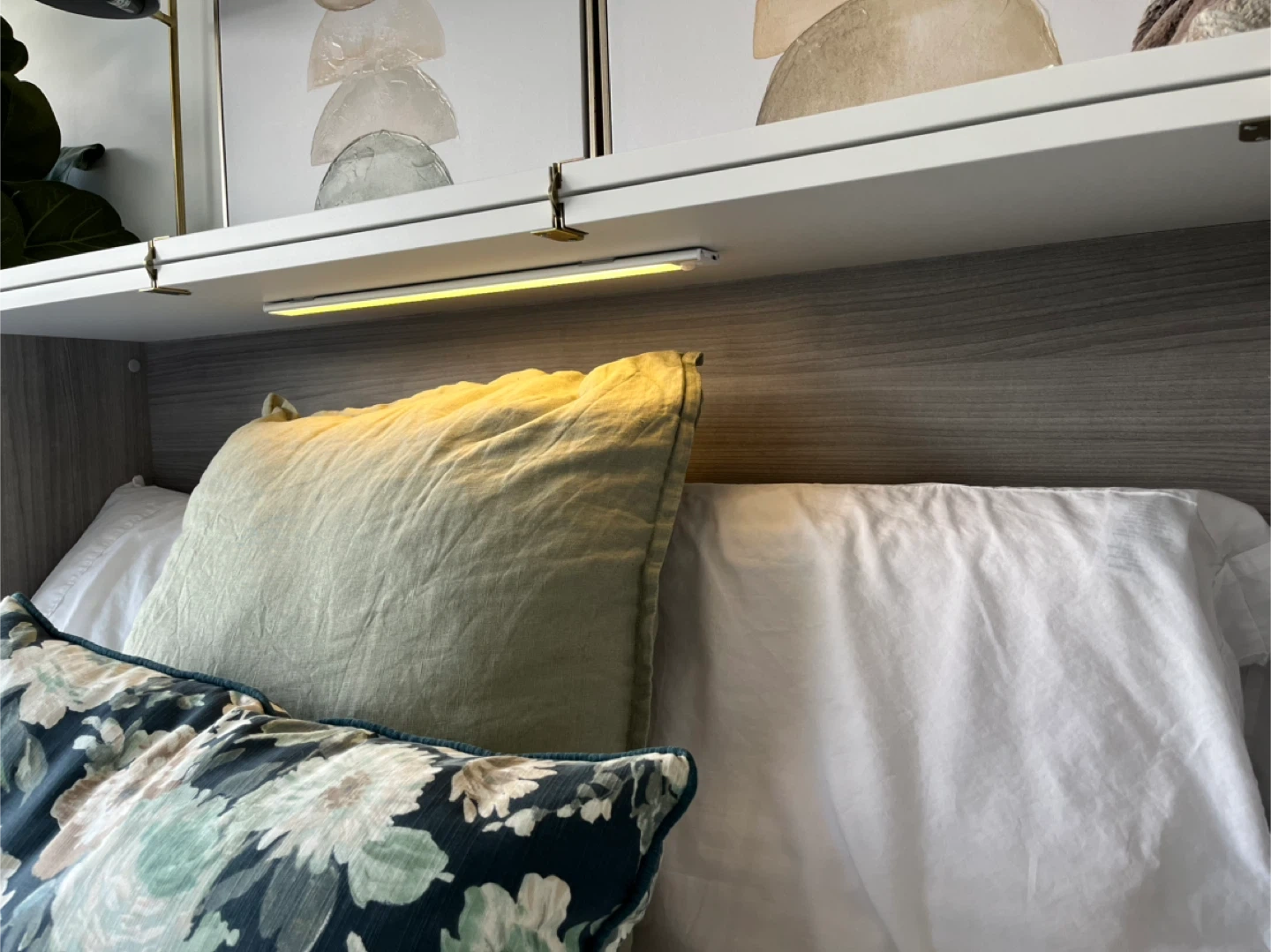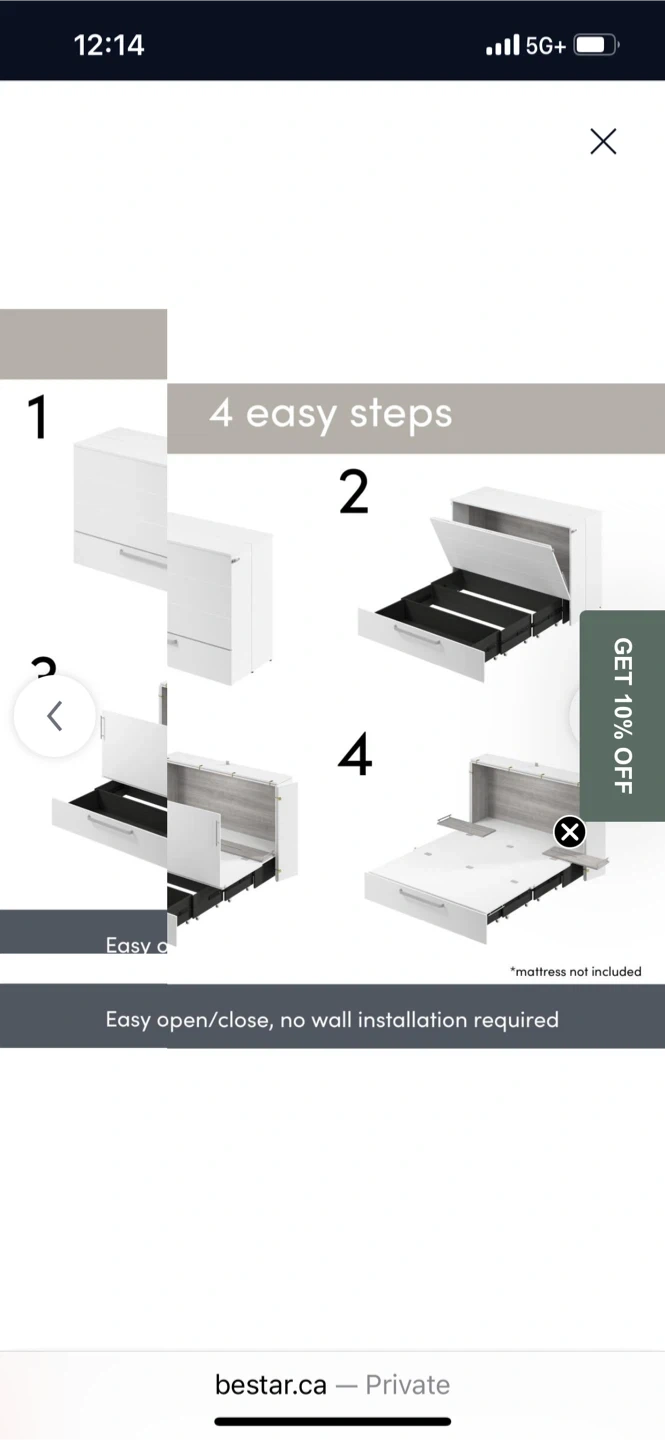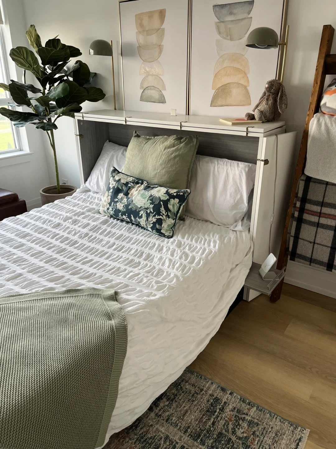Selling a Bestar Borealis Cabinet Bed in great condition! - Space-saving design with built-in storage - Rechargeable, motion-sensing LED lights - Two pull-out nightstand shelves - Easy unfolding mechanism - Full-extension slides and 12 casters ensure bed and drawer glide smoothly - Closed Dimensions: 56.9"W x 25.6"D x 40.6"H - Drawer Dimensions: 47.3"W x 17.5"D x 8.1"H - Pull-Out Shelf Dimensions (2): 13.0"W x 9.8"D x 0.6"H - Mattress platform supports up to 750 lbs (340 kg), excluding the mattress weight