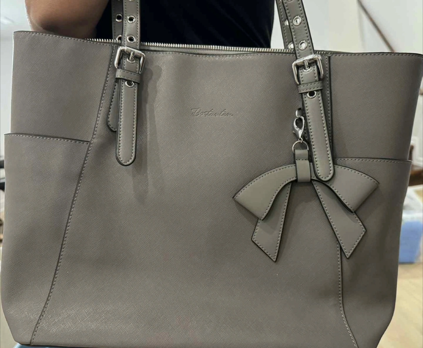 Selling a cute gray laptop bag by Bostanten. Fits 14 inch laptop. It's in great condition and perfect for everyday use. It features a stylish bow detail and has plenty of room inside for all your essentials