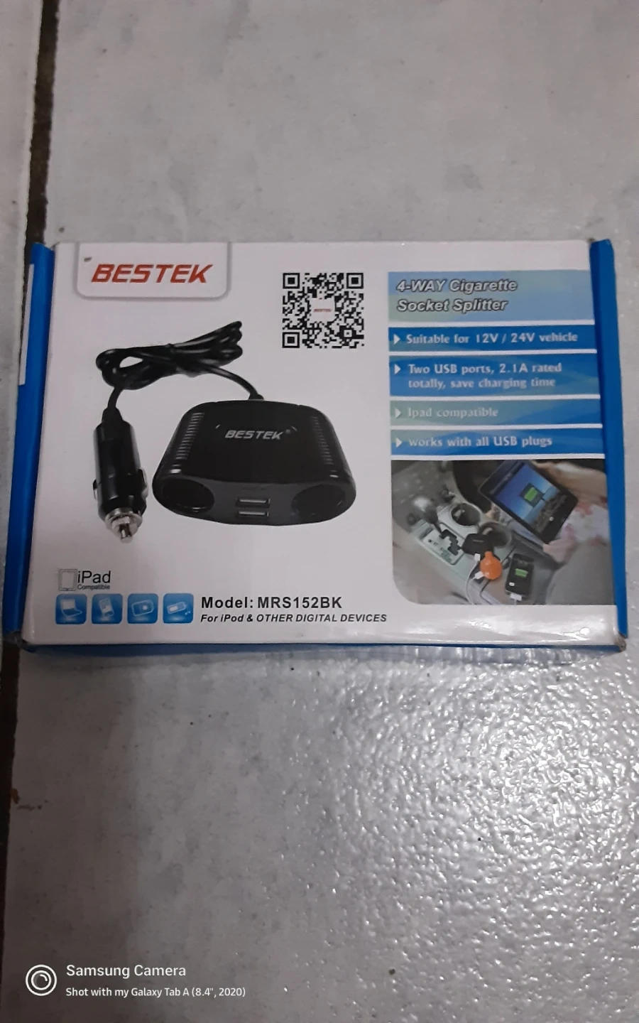 1000+Selling a BESTEK 4-Way Cigarette Socket Splitter, model MRS152BK. It's suitable for 12V/24V vehicles and has two USB ports rated at 2.1A. It also works with all USB plugs and is iPad compatible