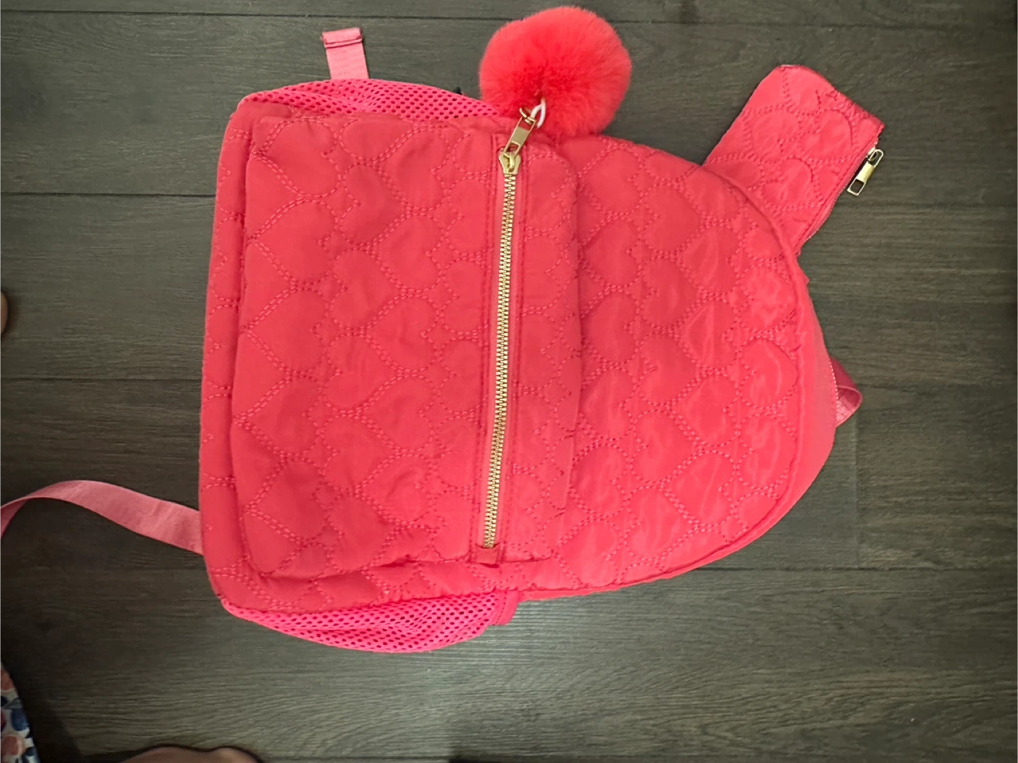 Super cute Betsey Johnson pink quilted backpack with a fun pompom detail! It has a front zipper and adjustable straps. Perfect for adding a pop of colour to any outfit