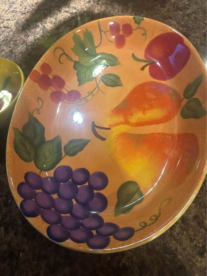 The collection features a vibrant, hand-painted fruit motif—including grapes, apples, and pears—on an orange or yellow background. Dishwasher and microwave safe.