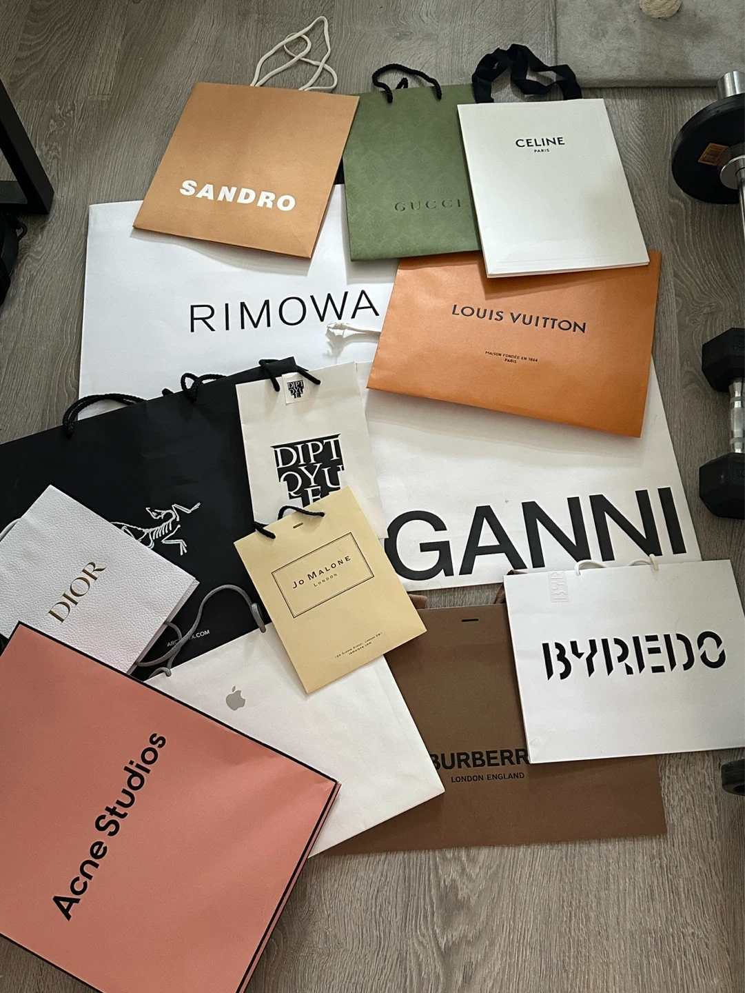 A collection of luxury shopping bags from various high-end brands. Includes bags from Dior, Acne Studios, Sandro, Gucci, Celine, Rimowa, Louis Vuitton, Jo Malone, Ganni, Byredo, and Burberry. These bags are perfect for organizing or for collectors.