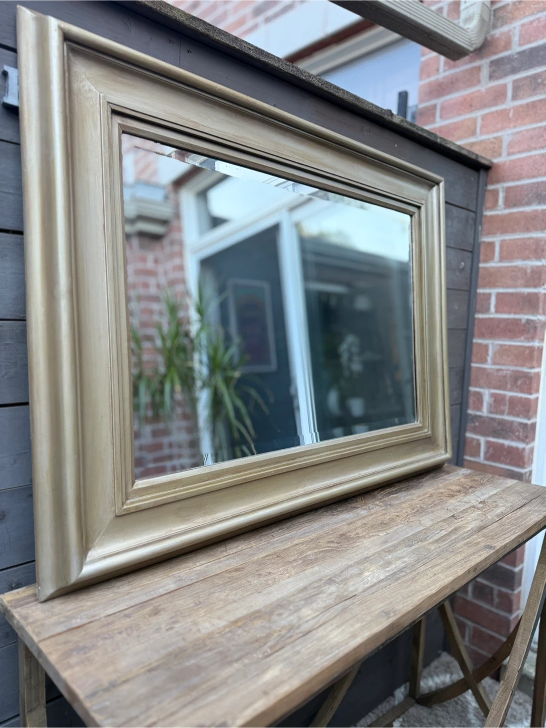 Silver- framed hanging beveled mirror that would look great in any hallway entrance, bathroom or living room! It's in good condition and ready to find a new home. Hang it horizontally or vertically….. hardware hooks in place