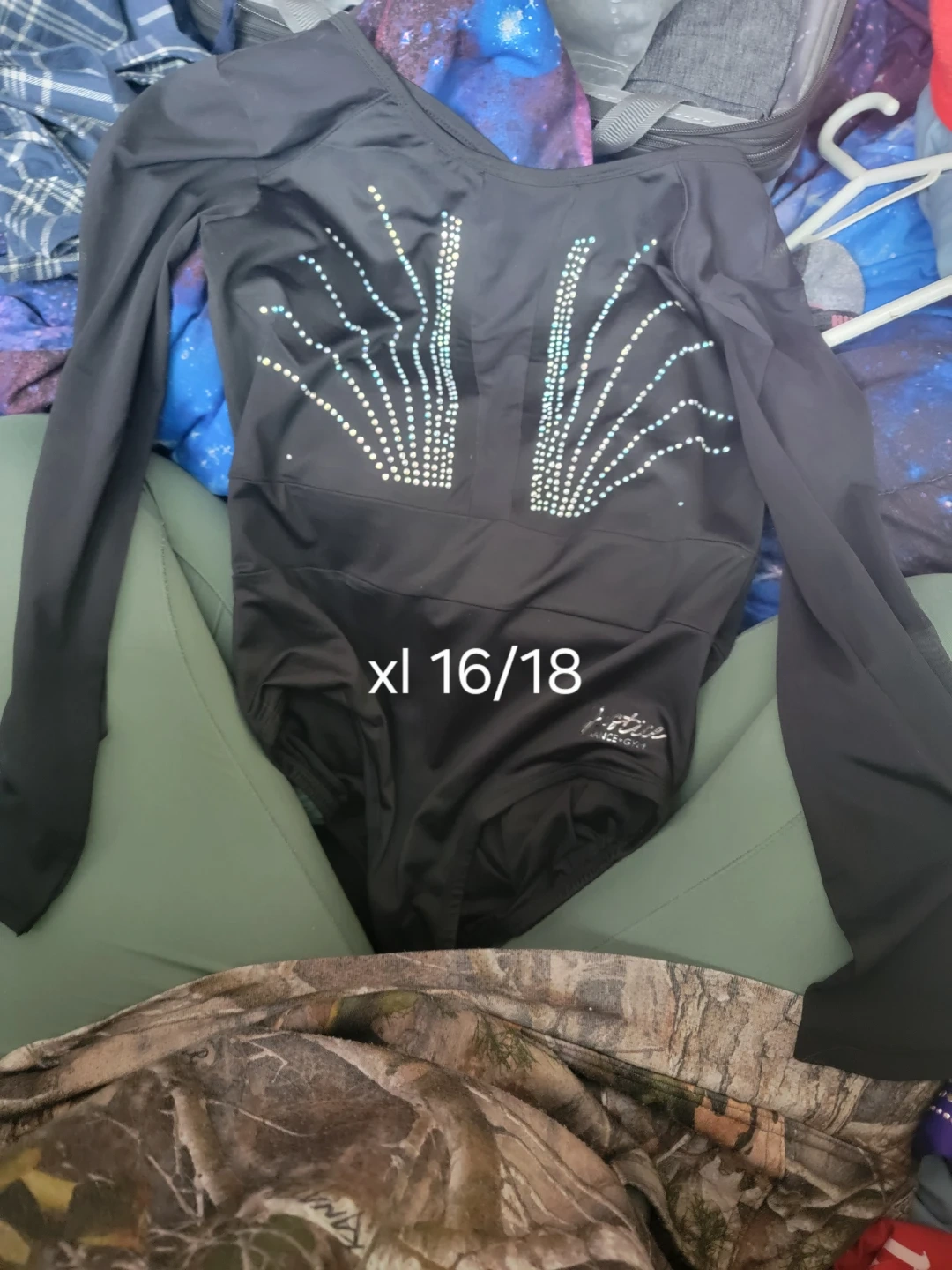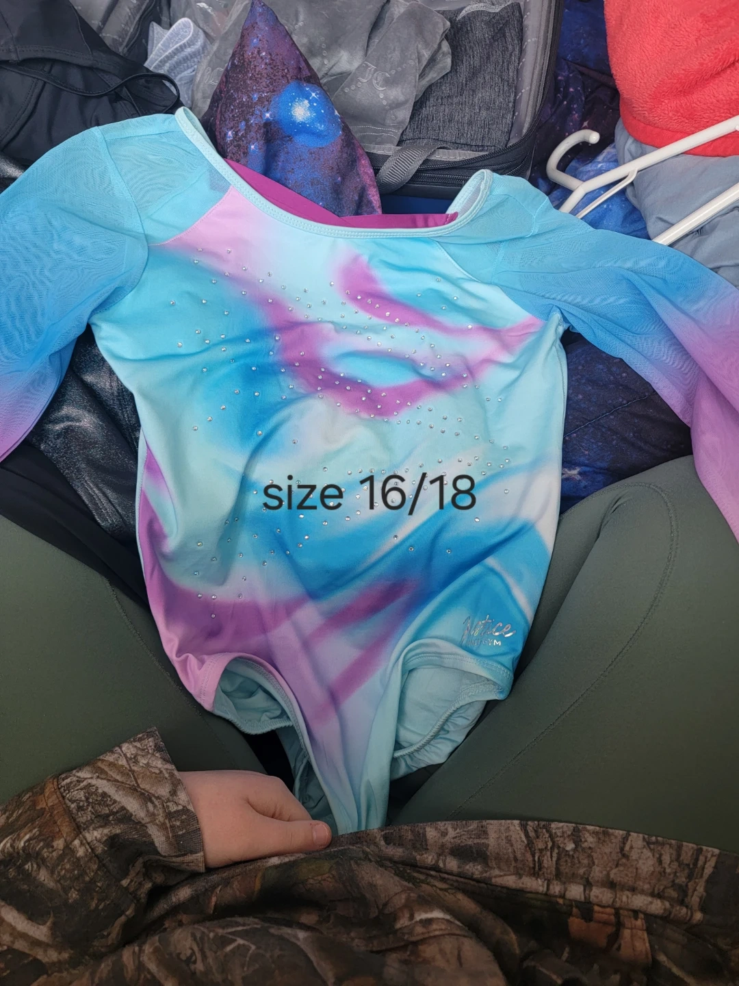 Three girls' gymnastics leotards in size 16/18. Features a black long-sleeve with rhinestones, a pink/blue tie-dye with rhinestones, and a mint/black metallic design. These are perfect for practice or competition!