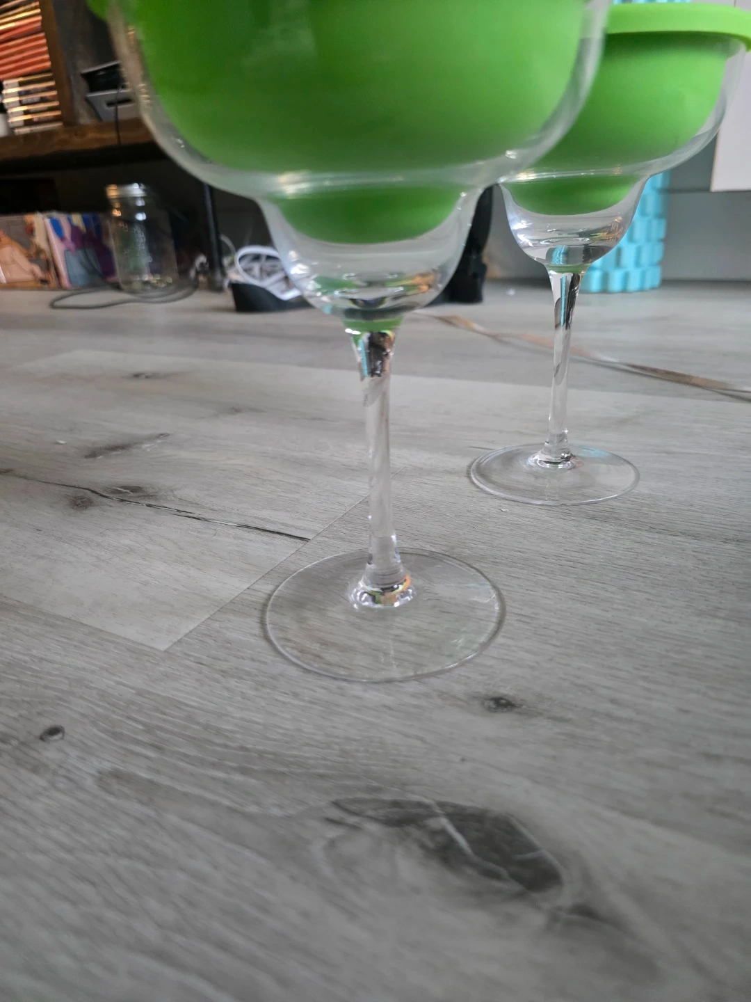 Two margarita glasses featuring removable bright green silicone inserts. These glasses are great for serving frozen or blended drinks. Silicone inserts are to mould ice down the walls for the glass for an always cold cocktail!