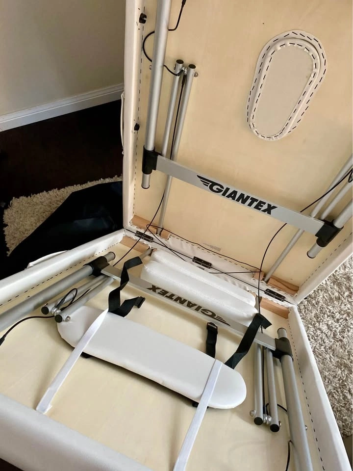 Bed is New: Size: 84” long with headrest, 64” without, 27” wide, arm rests 14” long each. Weight capacity: 550lb. Frame: Sturdy, folding massage bed (folds in half), aluminum frame, 8 adjustable heights, has a face cradle, adjustable and removable head rest, removable arm rests on sides and hand rest when face down under head rest. Includes carrying bag. Table's Weight: 13.6 kg. Material: white PVC.