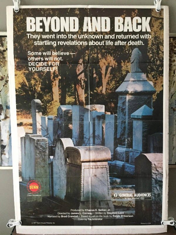 184Original one-sheet movie poster for "Beyond and Back", the 1977 James Conway documentary on near-death experiences. It stars Steve Riley, Vern Adix, Linda Bishop, Janet Bylund, and Richard Cannaday. Niagara Falls pick-up.