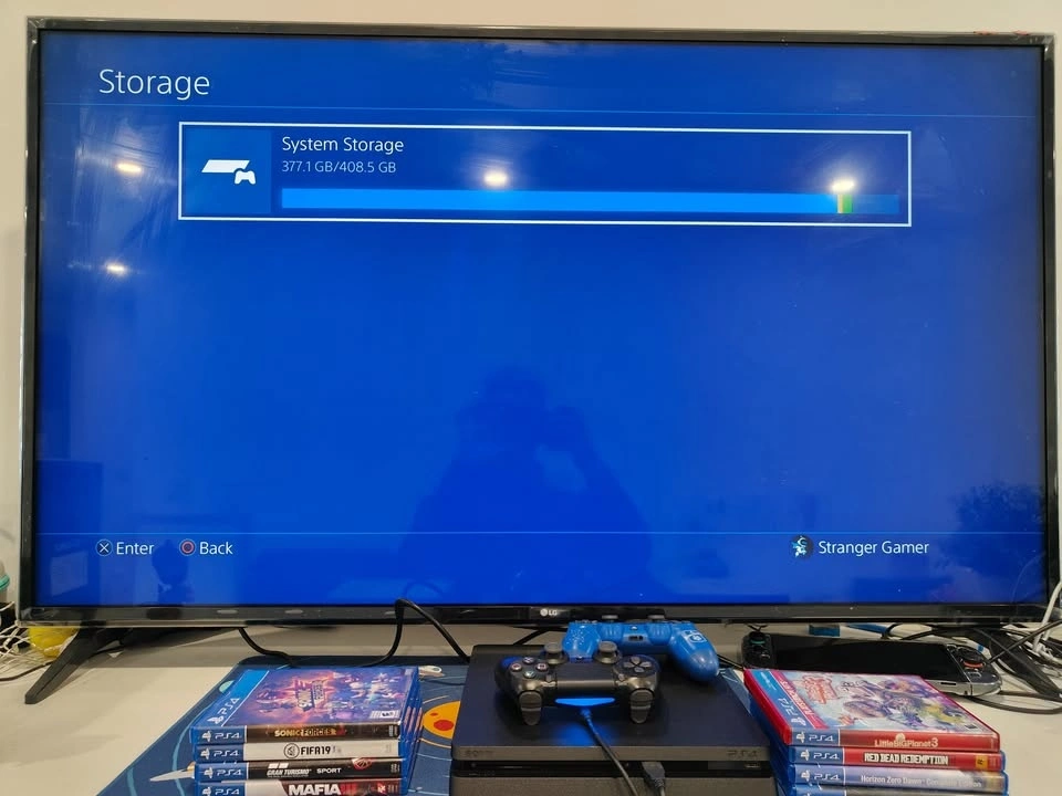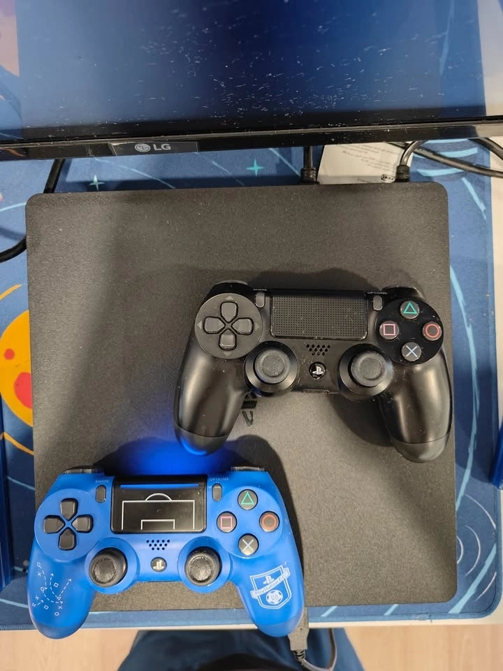 PS4 Slim in great working condition with 500GB internal storage. Includes 2 original controllers and 8 games — ready to play. Works perfectly except one controller has some drift. Includes: PS4 Slim console (500GB), 2 controllers, 8 games, Power cable.