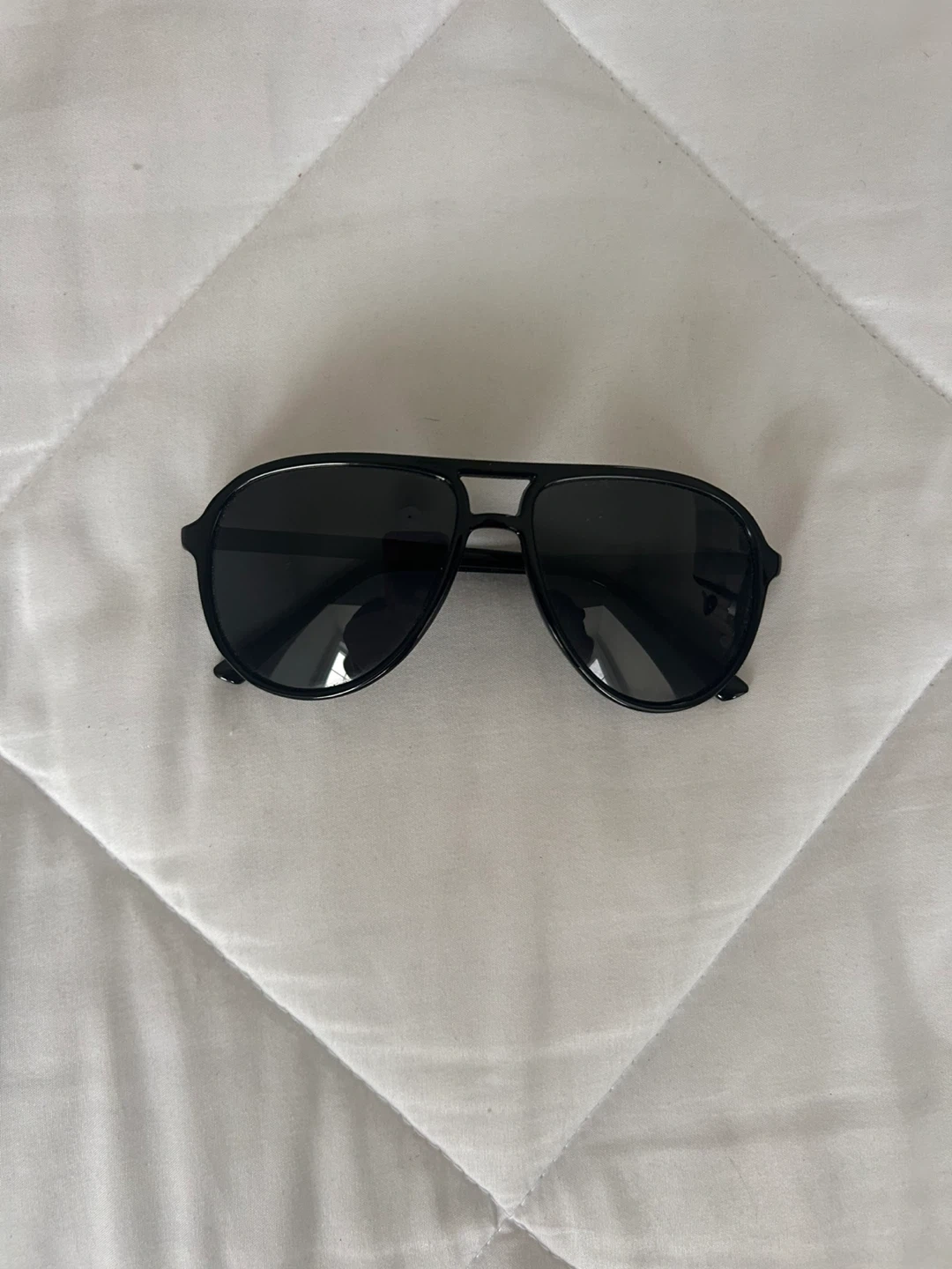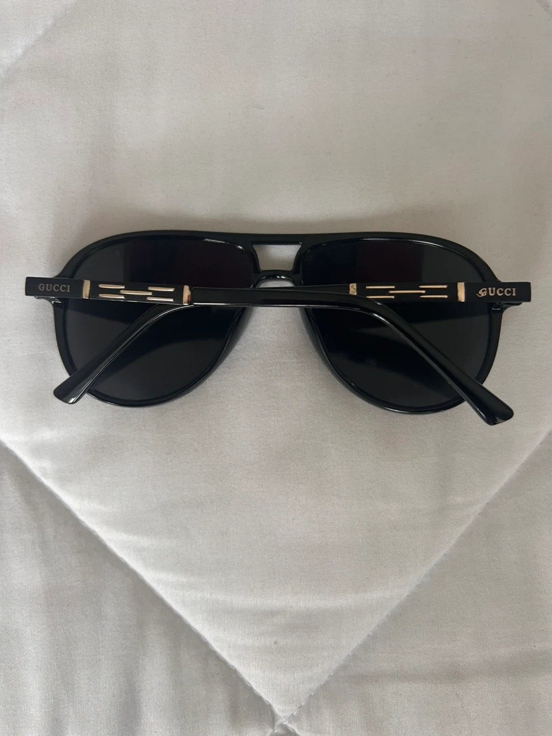 Black Gucci aviator sunglasses. These shades feature a sleek black frame and tinted lenses. They're perfect for sunny days and adding a touch of luxury to any outfit.