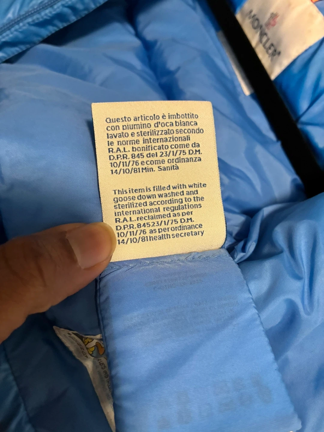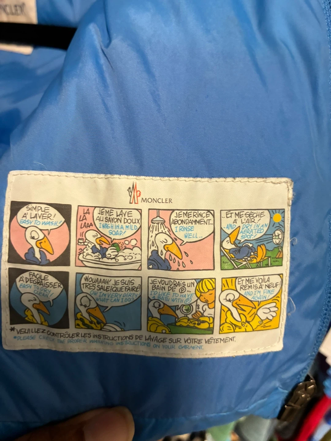 This blue Moncler puffer jacket is filled with white goose down. It features a cozy fur-lined hood. Easy to wash and care for following provided instructions. Size 6-9 months.