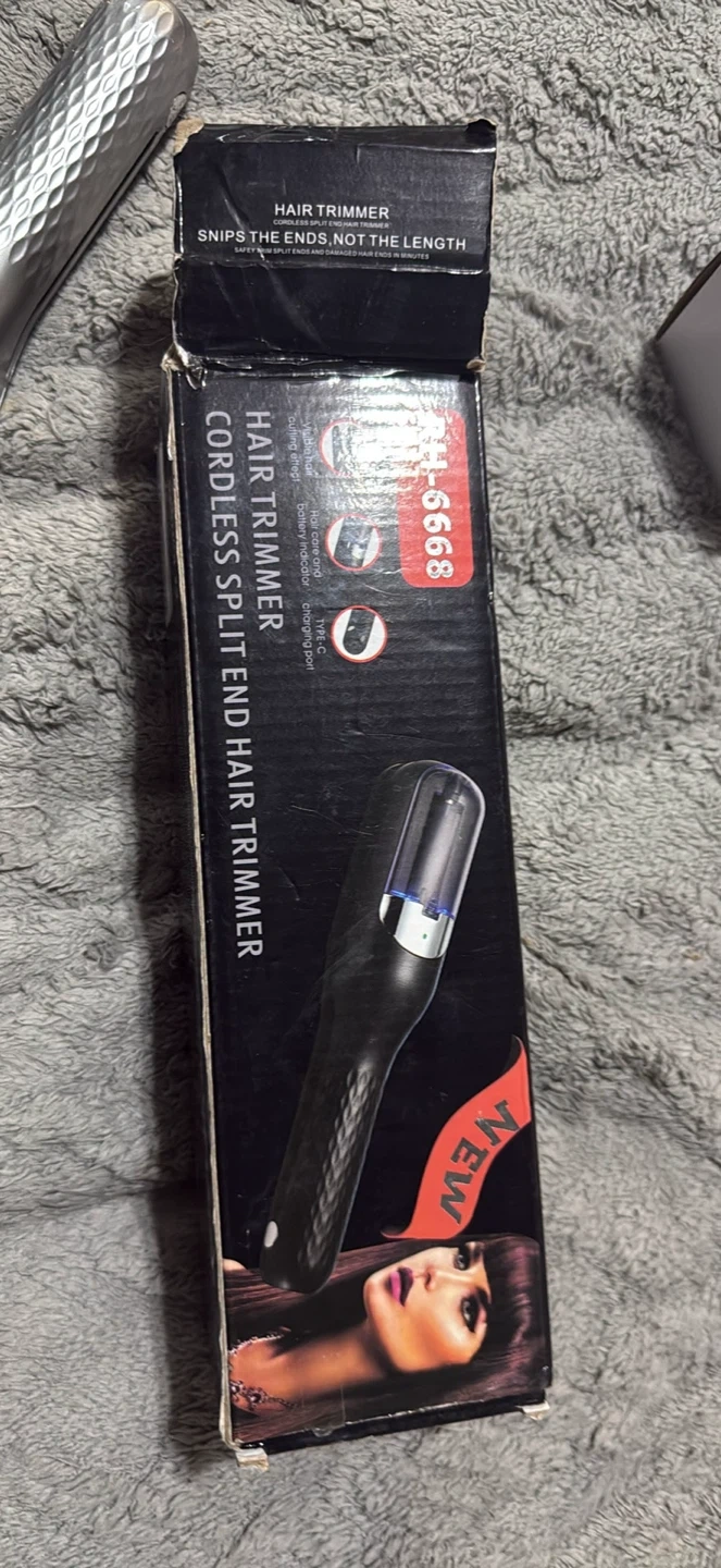Selling a new cordless split end hair trimmer! It's designed to snip the ends, not the length. The trimmer is silver and comes in its original box
