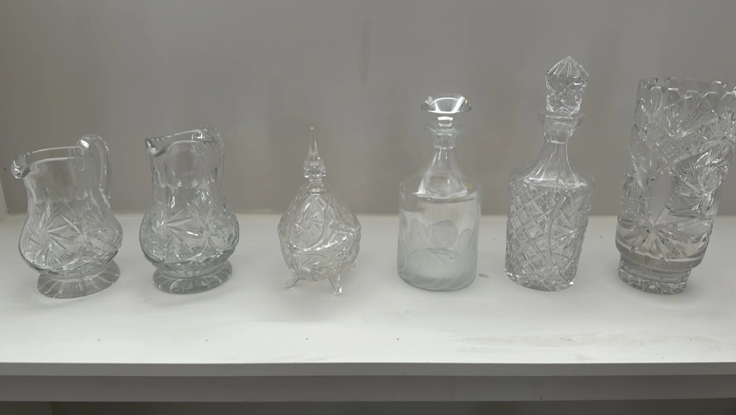 Collection of vintage cut glass pieces. Includes two creamer pitchers, a small covered dish, a decanter, a liquor bottle, and a vase. Elegant and detailed cut glass patterns.