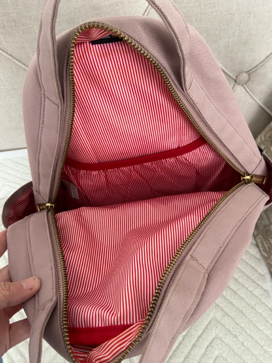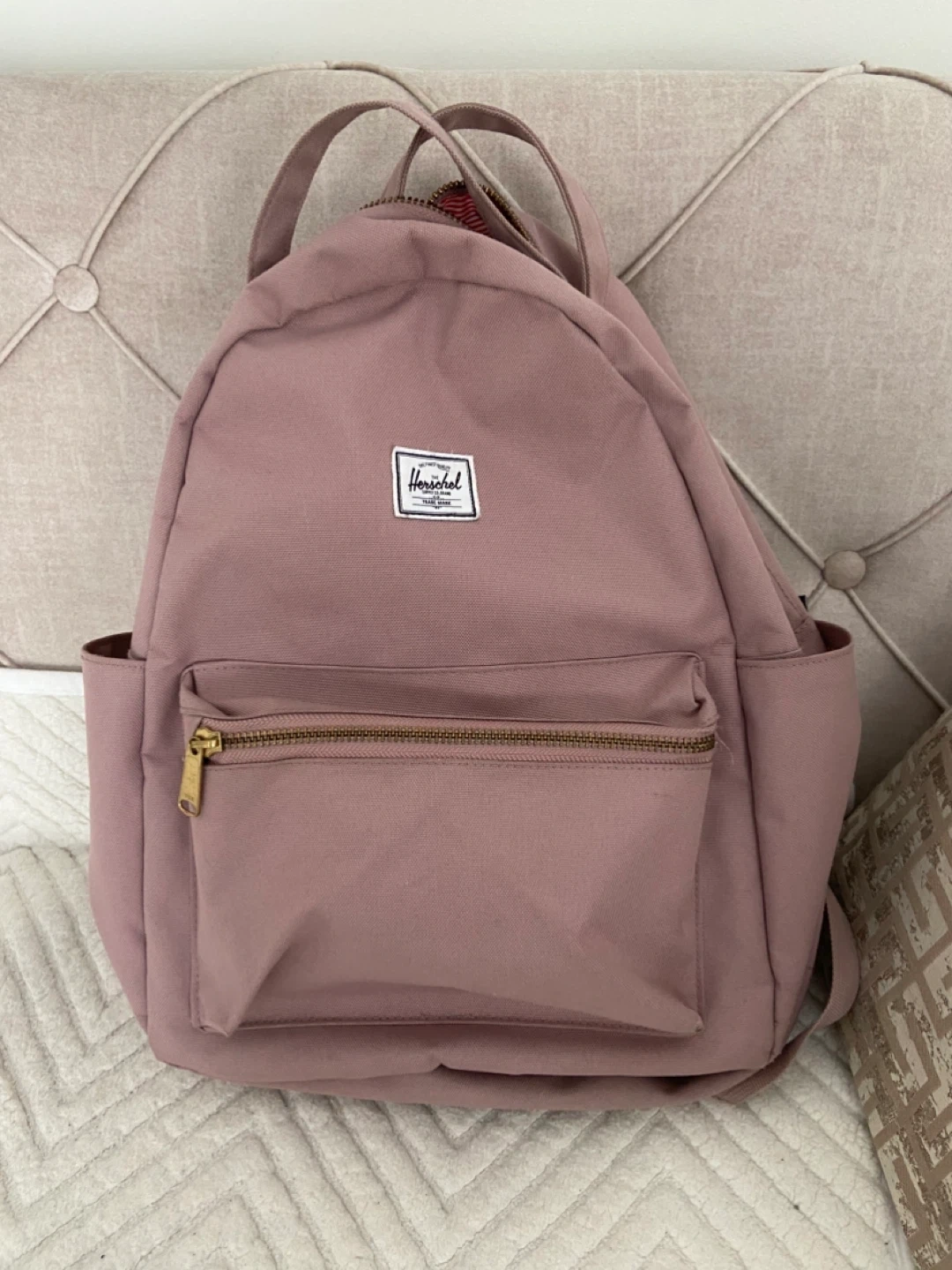 Herschel backpack in a lovely mauve colour. It features a classic striped lining and a front zippered pocket. This bag's spacious interior is great for carrying your daily essentials!