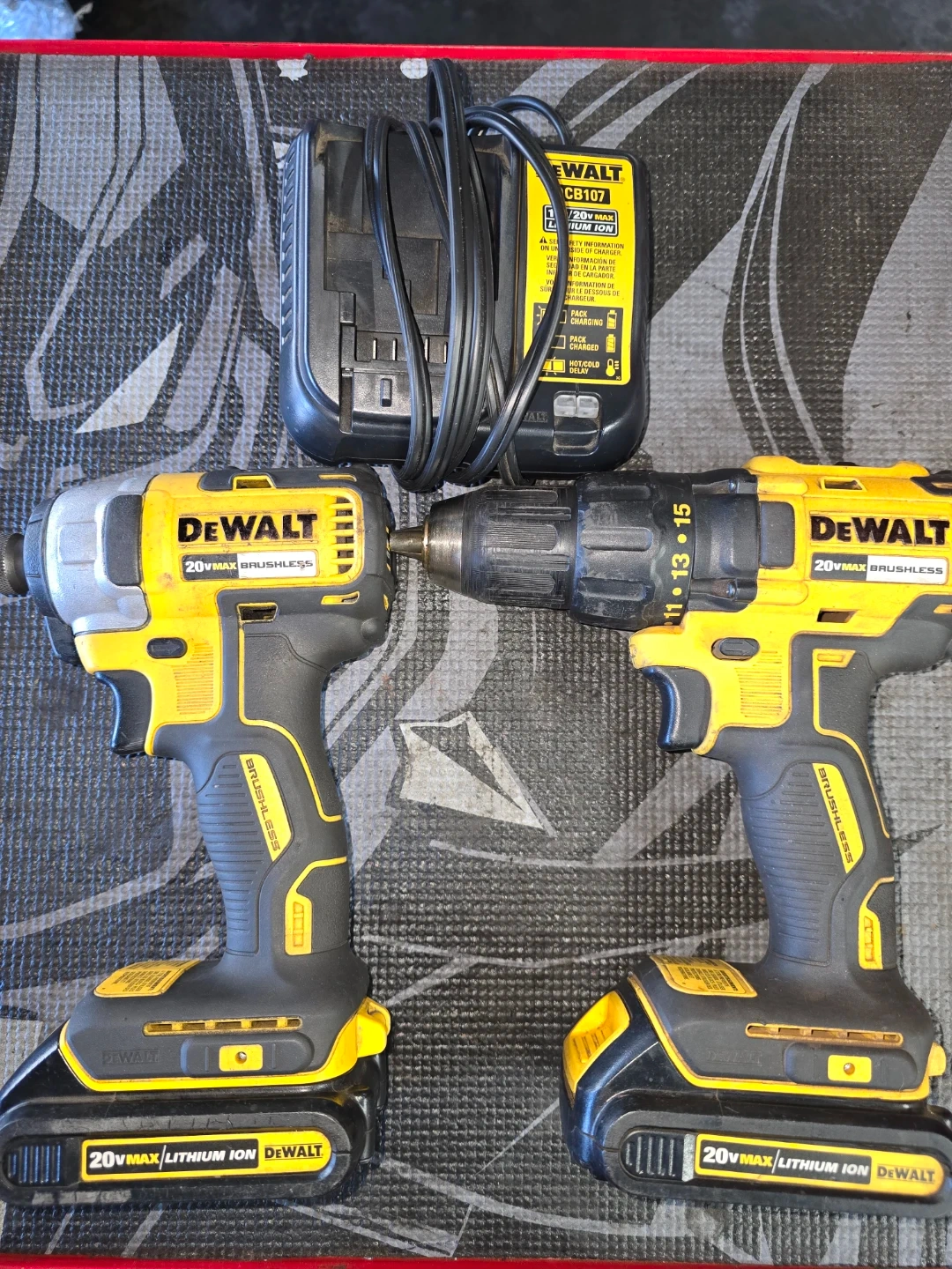 This DeWalt 20V MAX Brushless combo kit includes a drill and an impact driver. It comes with a charger and uses 20V Lithium Ion batteries 5 pice. Both tools are cordless and designed for durability.