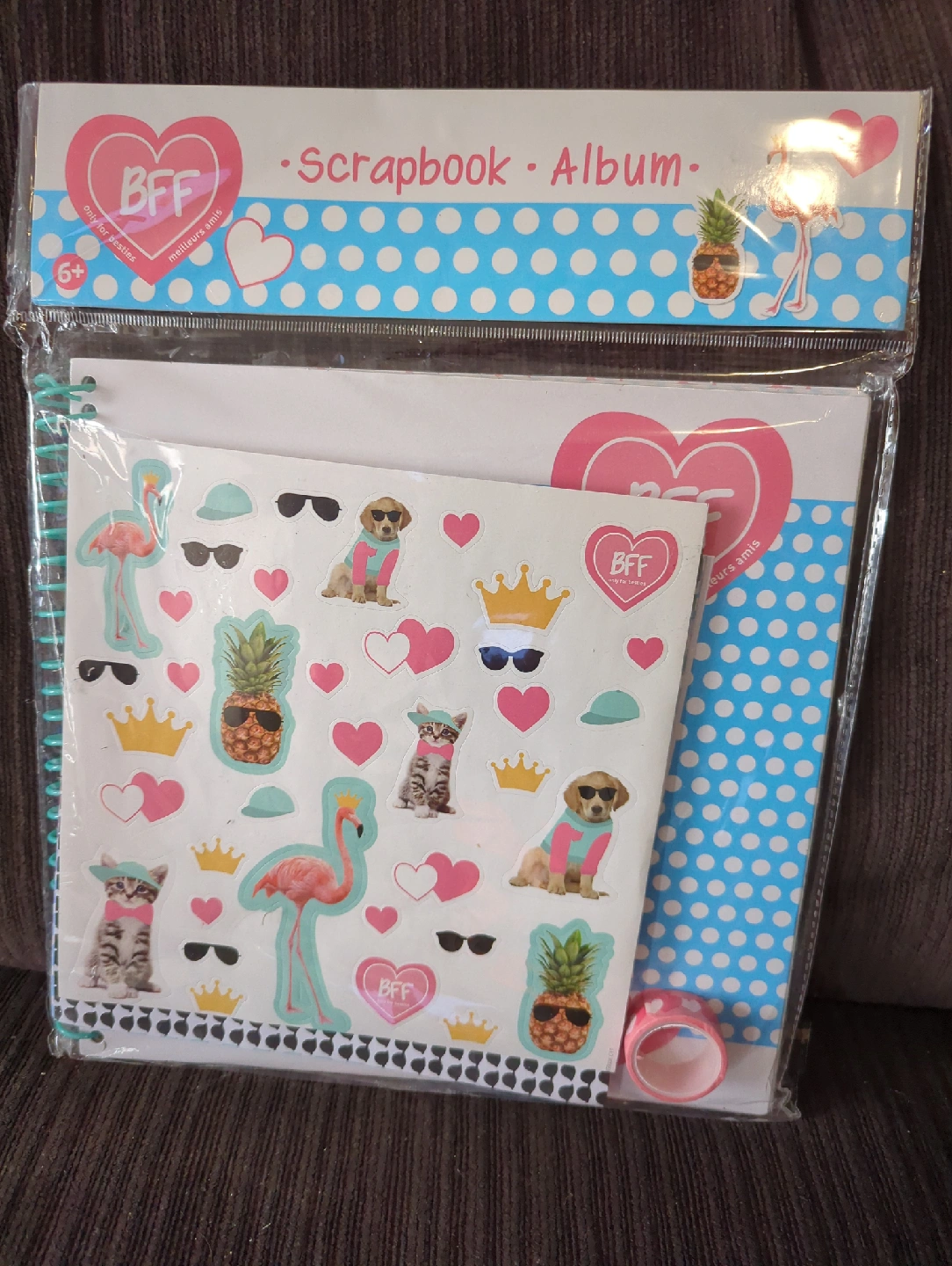 65I'm selling a brand new BFF scrapbook album! Perfect for crafting and preserving memories with your besties. Includes fun stickers with cute designs like flamingos, pineapples, and animals wearing sunglasses